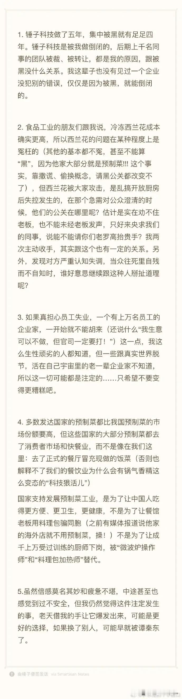 贾国龙与罗永浩的两点思考 1.西贝这家企业的叙事逻辑不是面向消费者而是企业家的自我表达,包括之前对员工好以及对消费者好本质上是满足企业家的自我价值实现,追求无我才可以长存。 另外老板要学会示弱,这和现在舆论环境无关,老板本身和消费者以及员工都是社会的节点。消费者是不会也没耐心了解前因后果的,不会有人去了解你西兰花的上下游产业链是否真的是对他们好,大家看热闹只是为了情绪; 2.贾国龙这次应该是死柬逻辑,已经不是面向公众表达了,告诉大家我个人资产的情况。 另外再输出一堆情绪后,本质上是要干罗永浩,罗永浩有被封号的危险。 但是不管怎么样,在我眼里还是失败的,长期看罗永浩一旦被封,西贝又站在胜者的位置上,新的舆论危机又会产生。 现在这个时代是中国有互联网时代最凌乱的时代,人群细分、价值观撕裂、群体无耐心,自媒体用算法把人群割裂成了一个又一个茧房。 没有对立和冲突,新闻是没有流量的。 短剧能够碾压传统影视,最核心的也是这个逻辑,需要观众无脑看个热闹就行,宣泄一下情况完事。 罗永浩 西贝贾老板