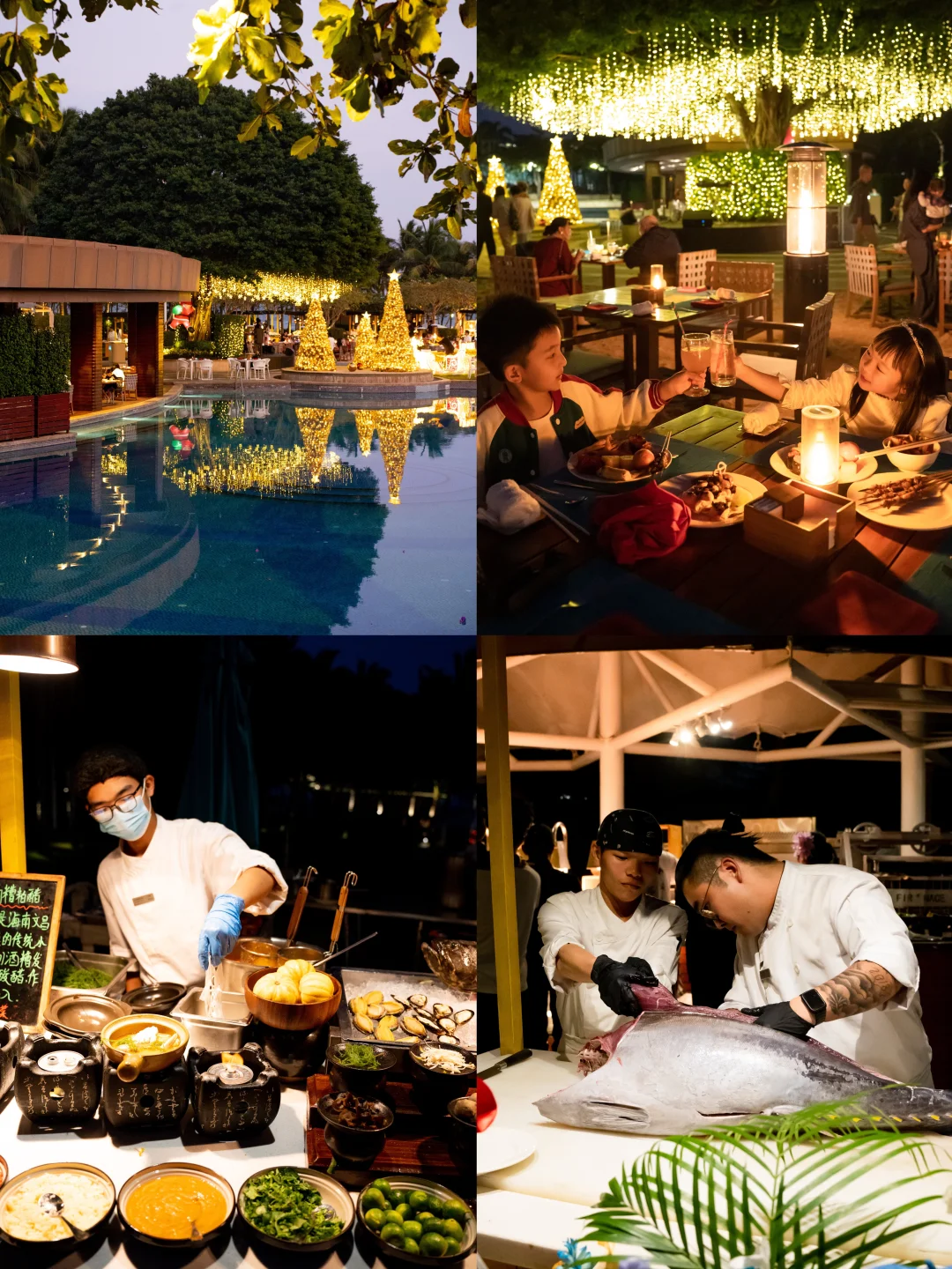 重点夸夸沙滩餐厅的海鲜自助!生蚝、刺身、烧烤应有尽有,新鲜又美味,孩子们也能找到爱吃的食物~晚餐后还有超震撼的火龙表演和无人机秀,灯光闪闪配上海风,氛围感直接拉满,仪式感十足!