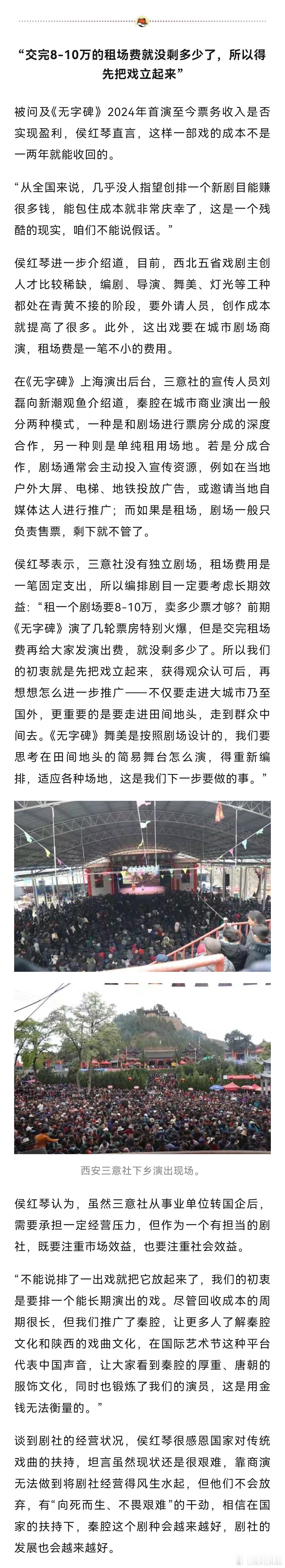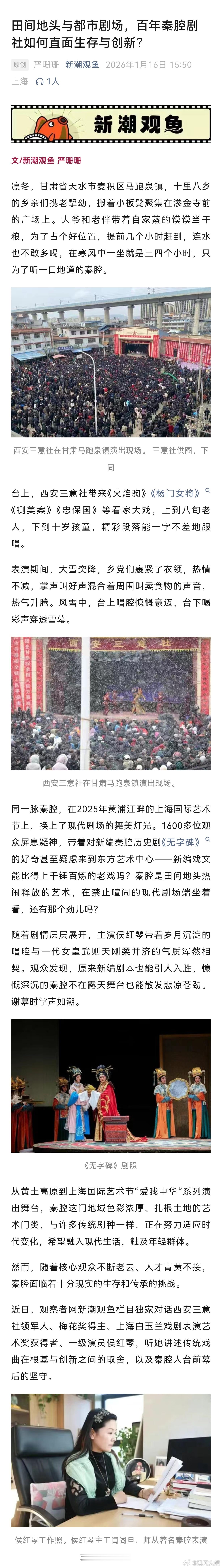 侯红琴说戏曲要拥抱的俗不是粗俗【田间地头与都市剧场,百年秦腔剧社如何直面生存与创新】三意社谈秦腔如何生存和创新近日,观察者网新潮观鱼栏目独家对话西安三意社领军人、梅花奖得主、上海白玉兰戏剧表演艺术奖获得者、一级演员侯红琴,听她讲述传统戏曲在根基与创新之间的取舍,以及秦腔人台前幕后的坚守。对于秦腔的未来,侯红琴不急着带领剧社靠“俗”破圈,也不认为要一味追求“雅”,她提到了近年来一个很热的概念:“守正创新。”“守正才能创新。你要思考是传递真善美,还是一味讨好观众,吸引眼球?是做长期坚守,还是只图一时热闹?我认为前路虽然不易,但我们的根不能丢。我们可以借助传播吸引关注,但必须把握好这个度,戏曲要拥抱的‘俗’不是粗俗,而是接地气的人间烟火,要给观众树立正确的三观,传递真善美,底线不能丢。”