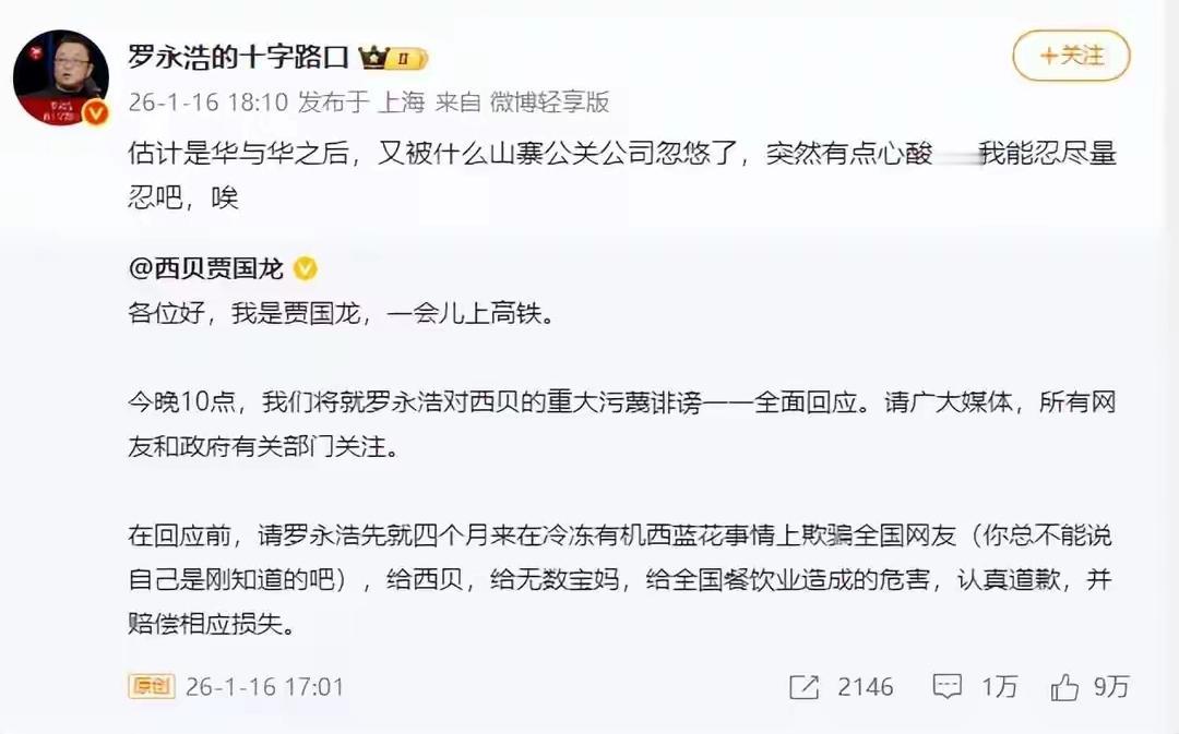 西贝贾老板又用“重大污蔑诽谤”炮轰罗永浩, 罗永浩回应说贾老板估计又被山寨公关忽悠了, 有点心酸, 能忍尽量忍吧 …… 说实话, 别说罗永浩了, 连我这样的普通人都都觉得有点于心不忍, 西贝好惨[捂脸][捂脸]