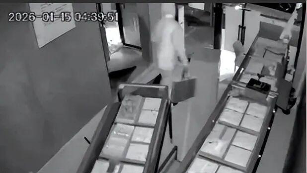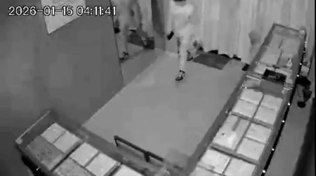 紧接着,该账号发布第二段视频,该视频为店内监控录像,时间显示从1月15日凌晨3时45分许持续到4时40分许,记录了一名年轻白衣男子砸门进入店内洗劫饰品柜台的全过程,期间,该男子还曾大幅度推动一侧柜台,将一只疑似保险柜的物件推出店外。这一过程中,另一身着深色衣服的男子还将一辆电动车骑进店内。最后,透过金店玻璃门一角可看到,盗窃男子疑似骑乘一辆电动车离开。