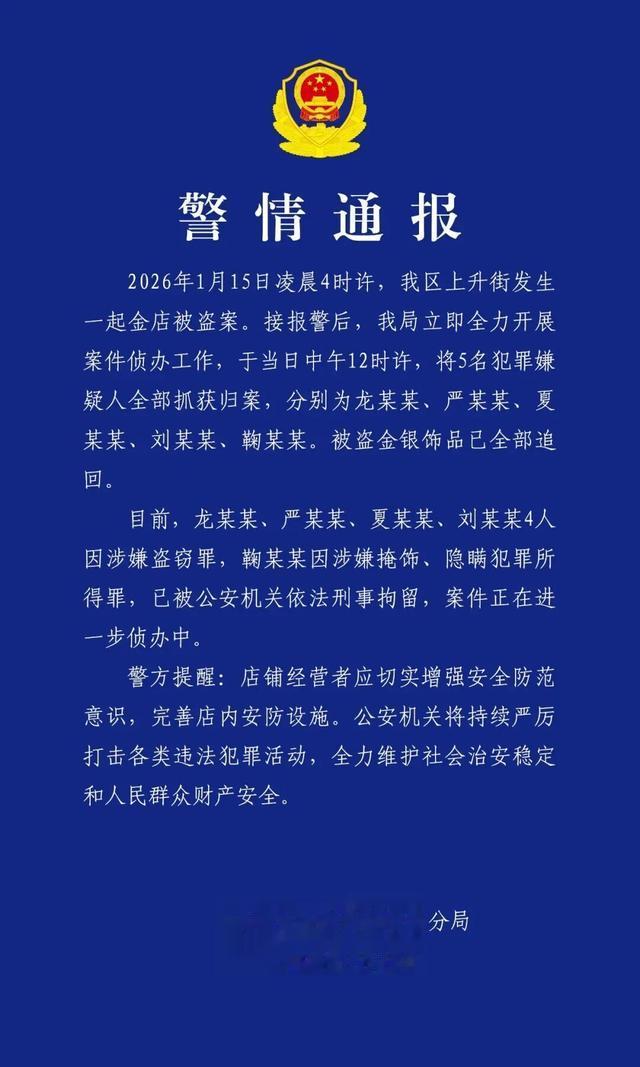 2026年1月15日凌晨4时许,我区上升街发生一起金店被盗案。接报警后,我局立即全力开展案件侦办工作,于当日中午12时许,将5名犯罪嫌疑人全部抓获归案,分别为龙某某、严某某、夏某某、刘某某、鞠某某。被盗金银饰品已全部追回。