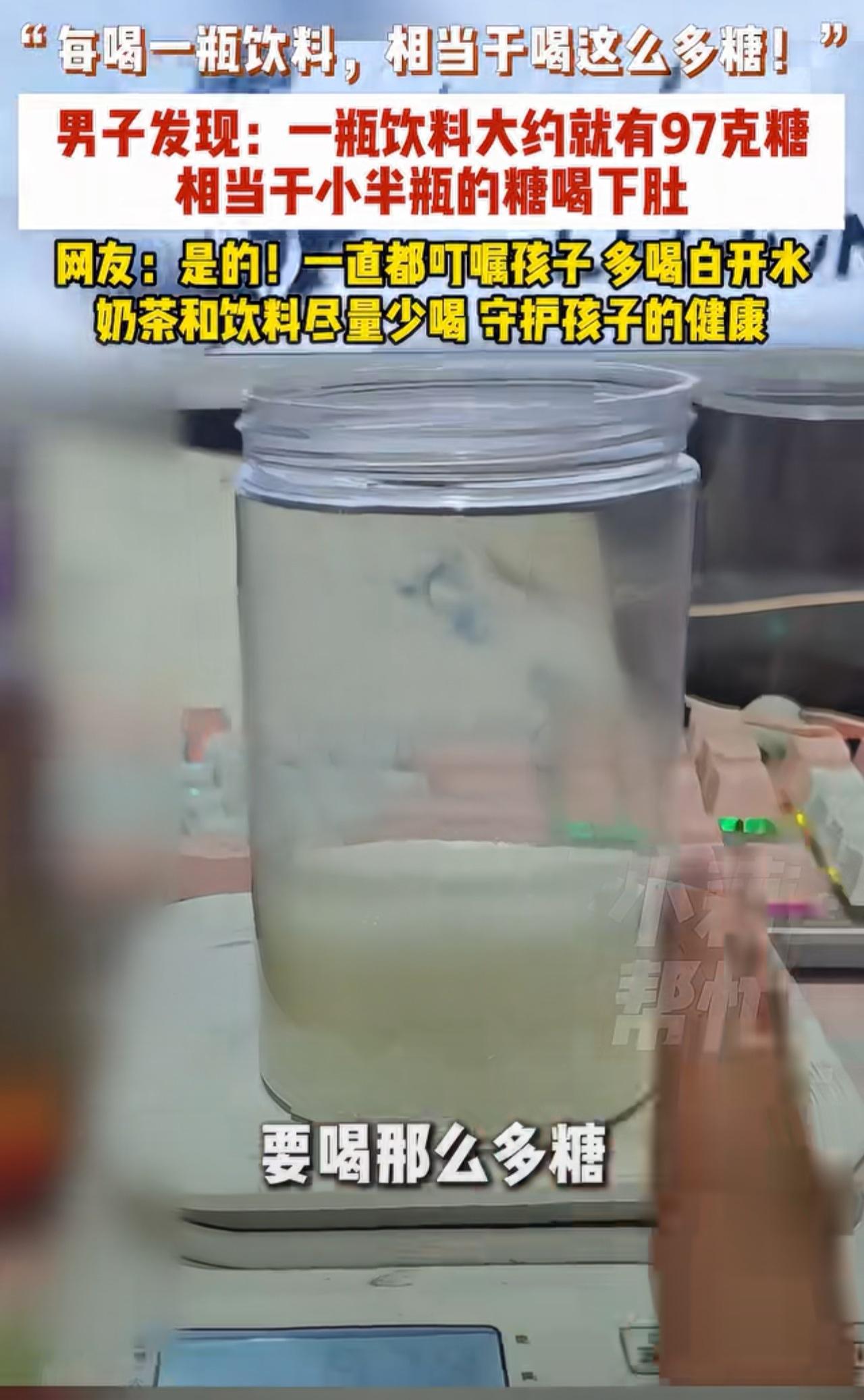 我去!这个饮料我家里经常有,还很好喝,没想到那么多糖。 近日安徽,“每喝一瓶饮料,相当于喝这么多糖!”男子发现:一瓶饮料大约就有97克糖,相当于小半瓶的糖喝下肚。 100mL有9.7,一瓶是1L=1000mL,9.7×10=97。 那些相信的,你们不会没吃过糖吧,二两糖化进二斤水里面你不得齁甜?为什么冰红茶没有那么甜? 冰红茶里面的碳水就是糖啊,看看配料表吧,第一位水,第二位糖,后面就是色素,防腐剂,香精。