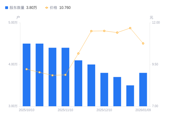 日期A股户数(户)流通A股户均持股数(股)户均持股市值(万元)2026-01-093800023744.6325.552025-12-313500025779.8830.112025-12-193700024386.3827.822025-12-103800023744.6327.332025-11-284000022557.4025.942025-11-204100022007.2222.362025-11-104400020506.7218.212025-10-314400020506.7218.152025-10-204500020051.0218.112025-10-104500020051.0218.49