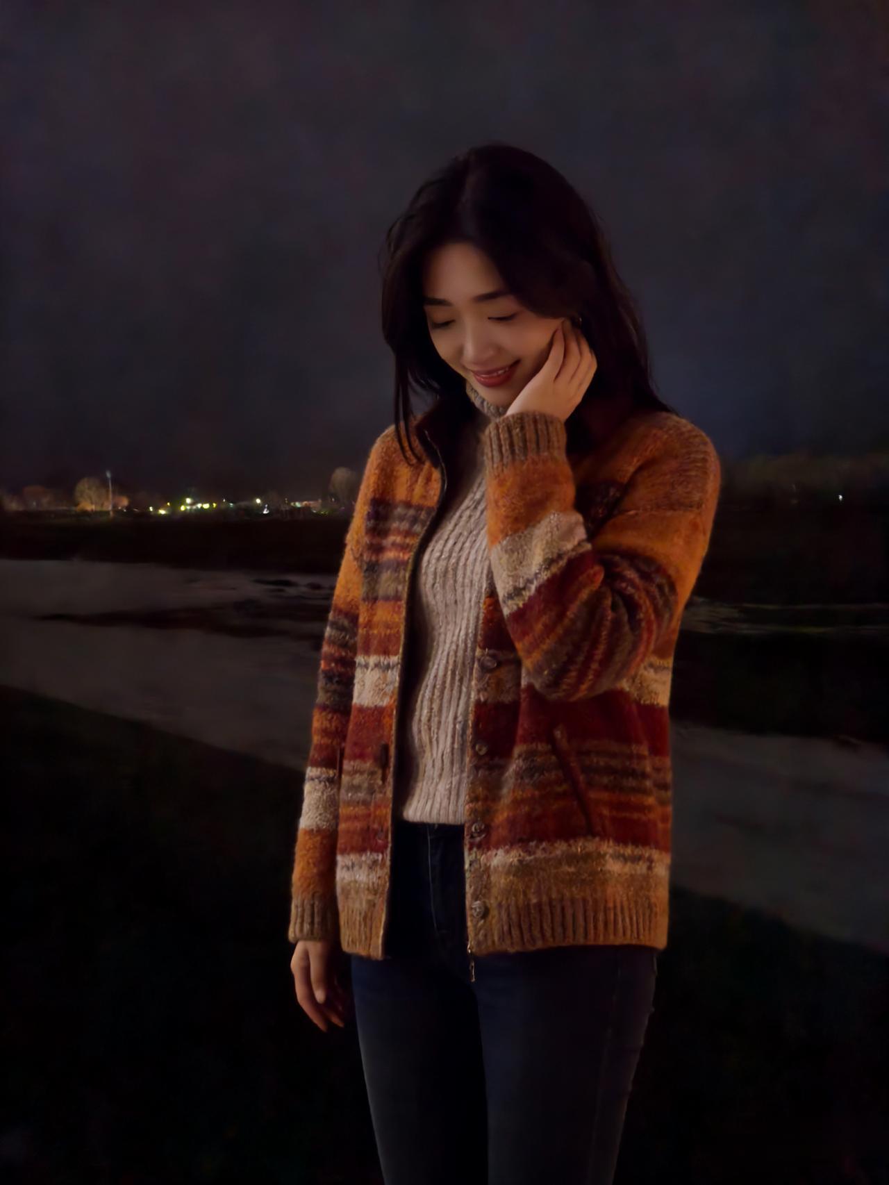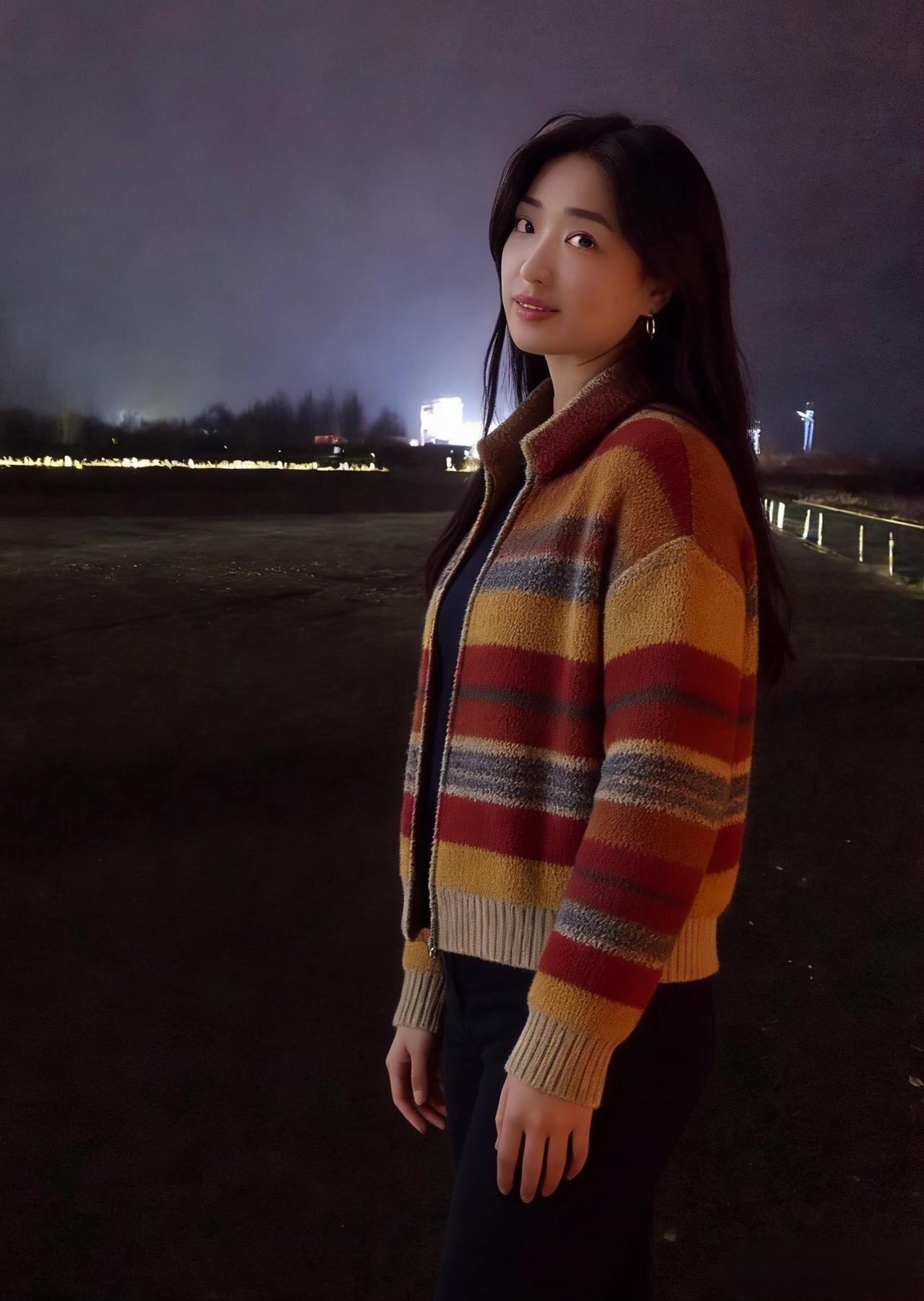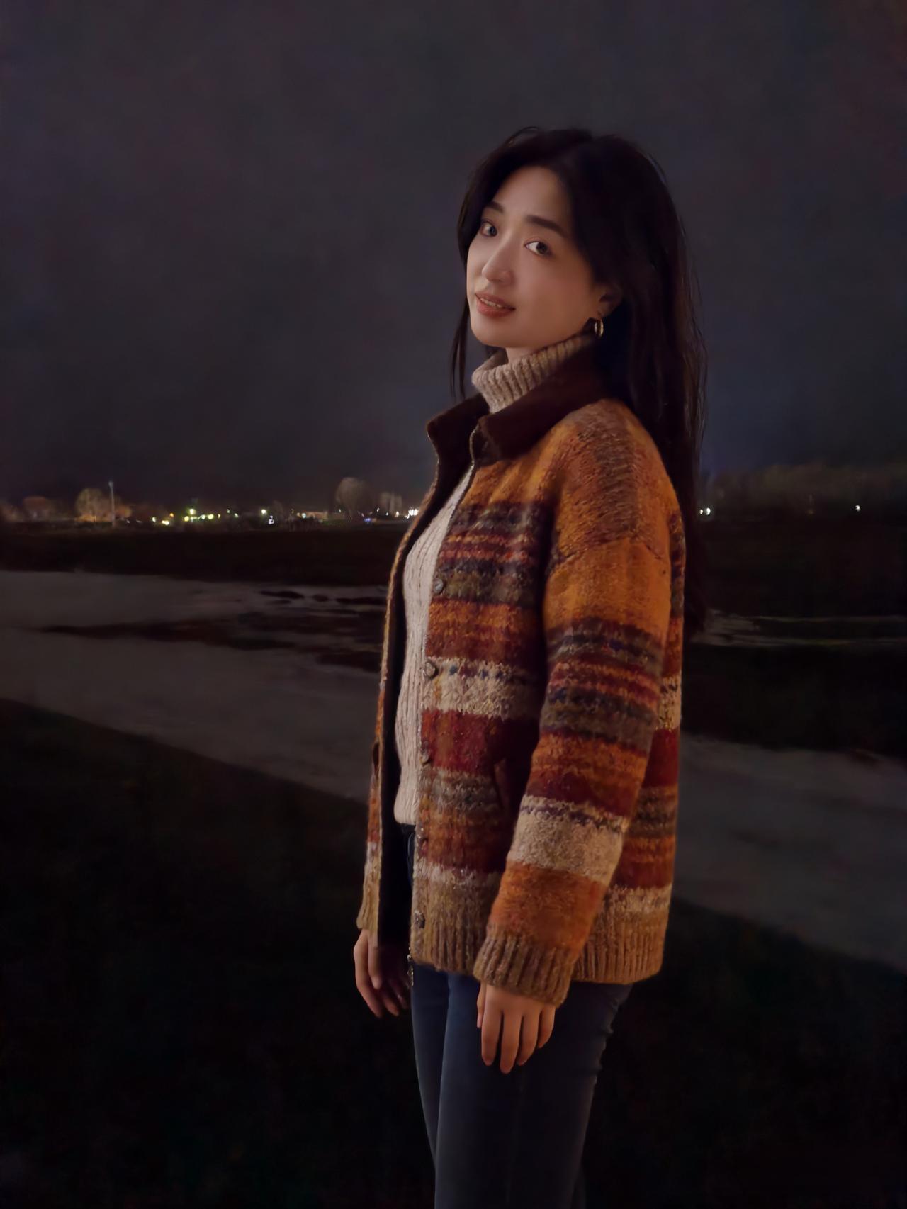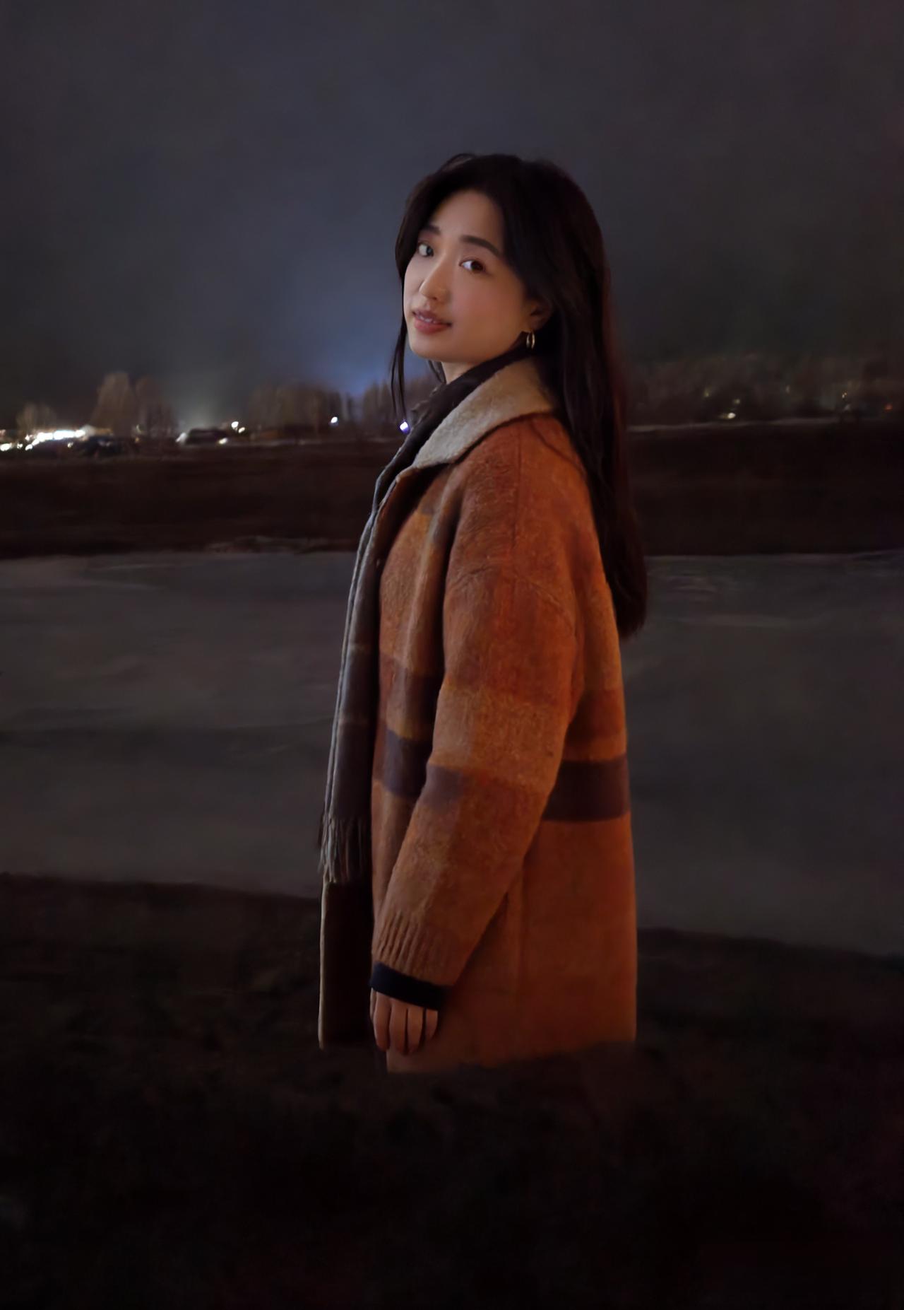 夜满郊原寒色重,佳人独立霜风。焦糖织袄衬颜红。 眸光凝远岫,笑意荡晴空。 … 莫道冬宵无暖意,一颦一笑情浓。疏灯遥映影玲珑。 晚风知惜玉,绕袂不教逢。