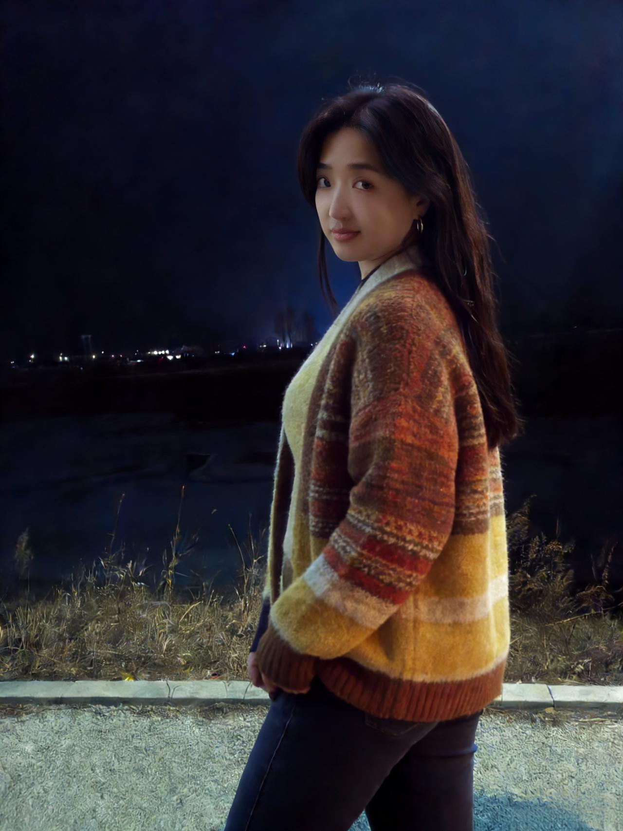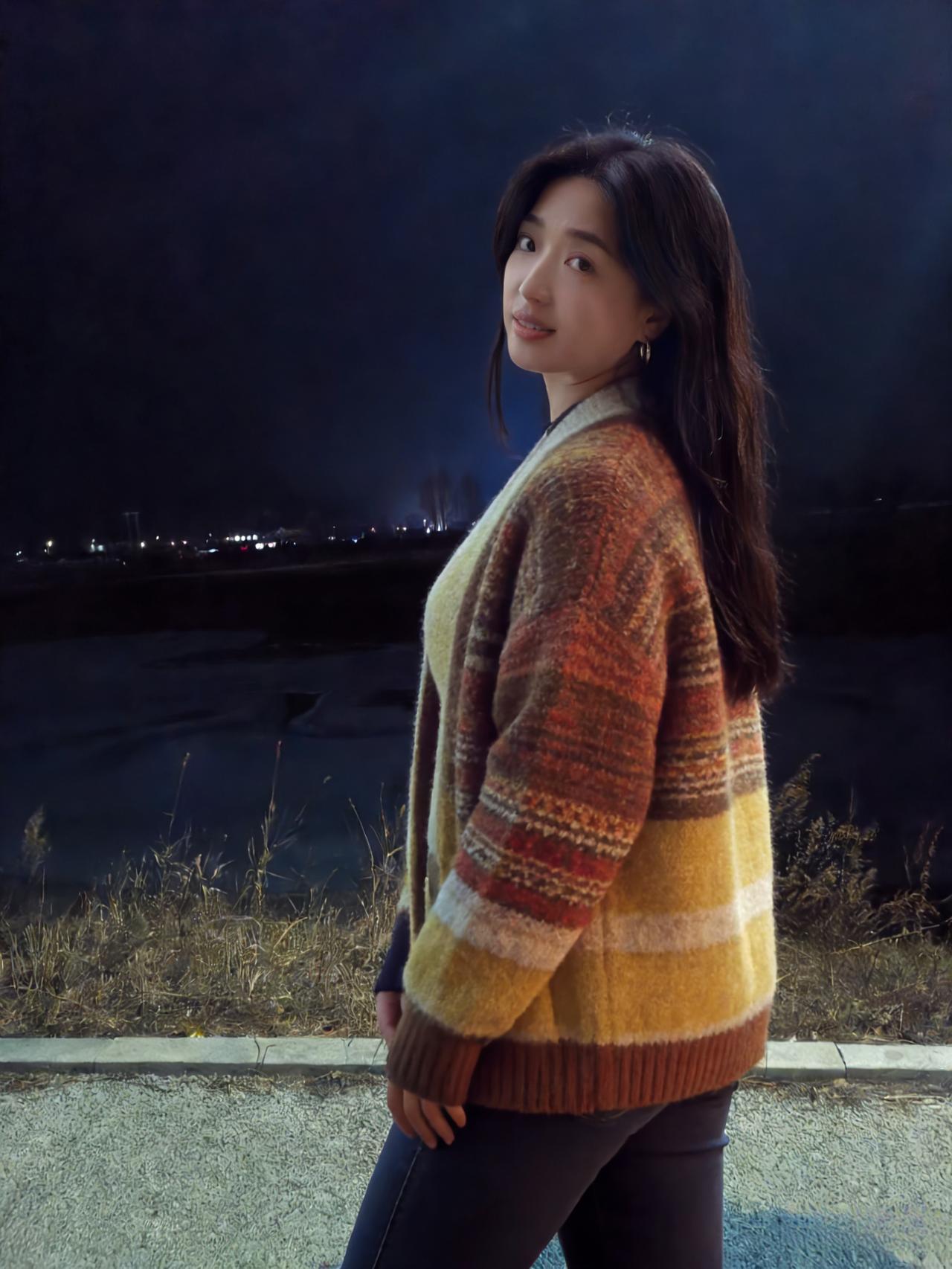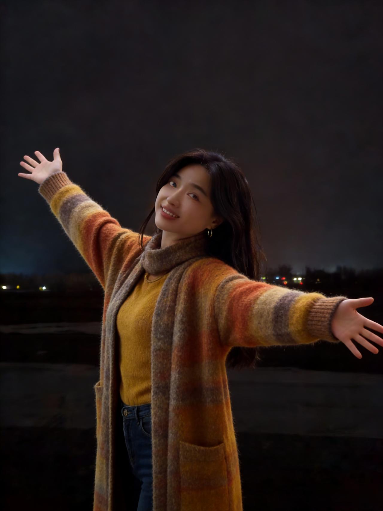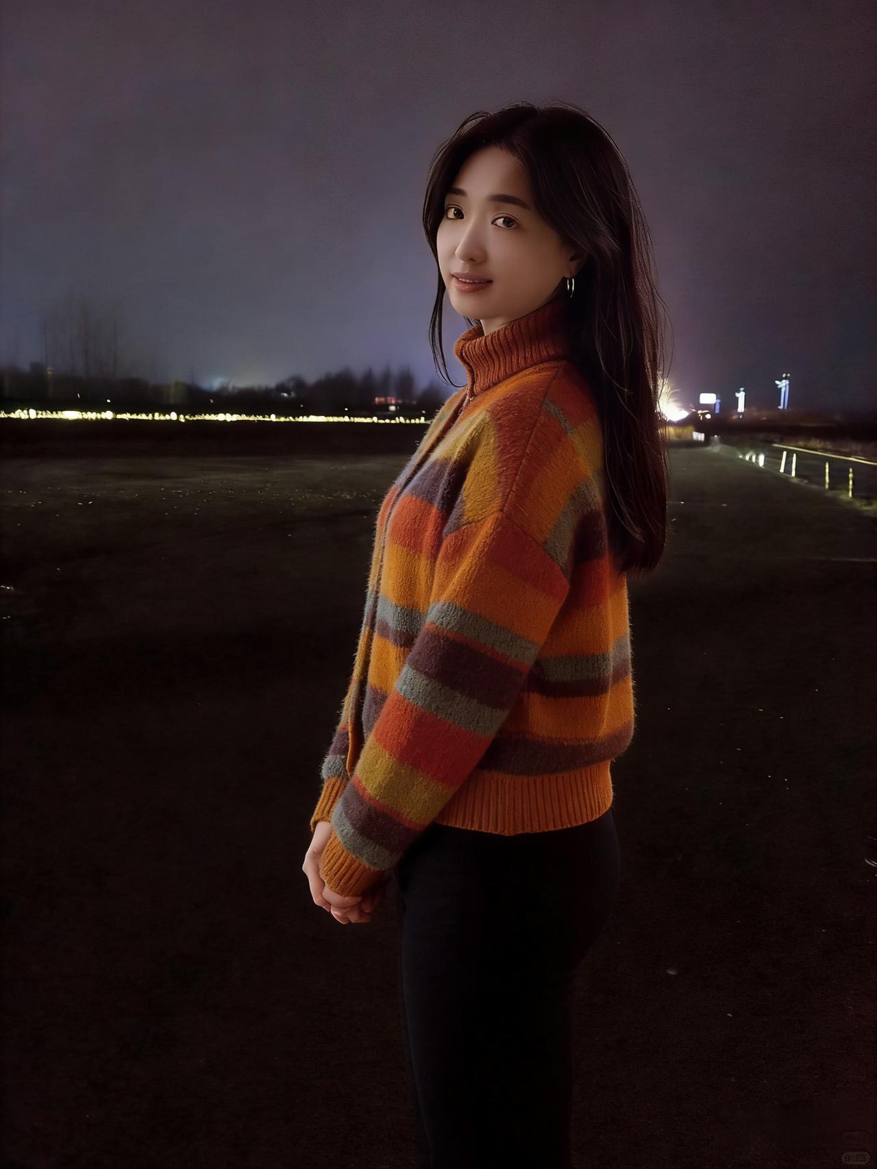 夜满郊原寒色重,佳人独立霜风。焦糖织袄衬颜红。 眸光凝远岫,笑意荡晴空。 … 莫道冬宵无暖意,一颦一笑情浓。疏灯遥映影玲珑。 晚风知惜玉,绕袂不教逢。