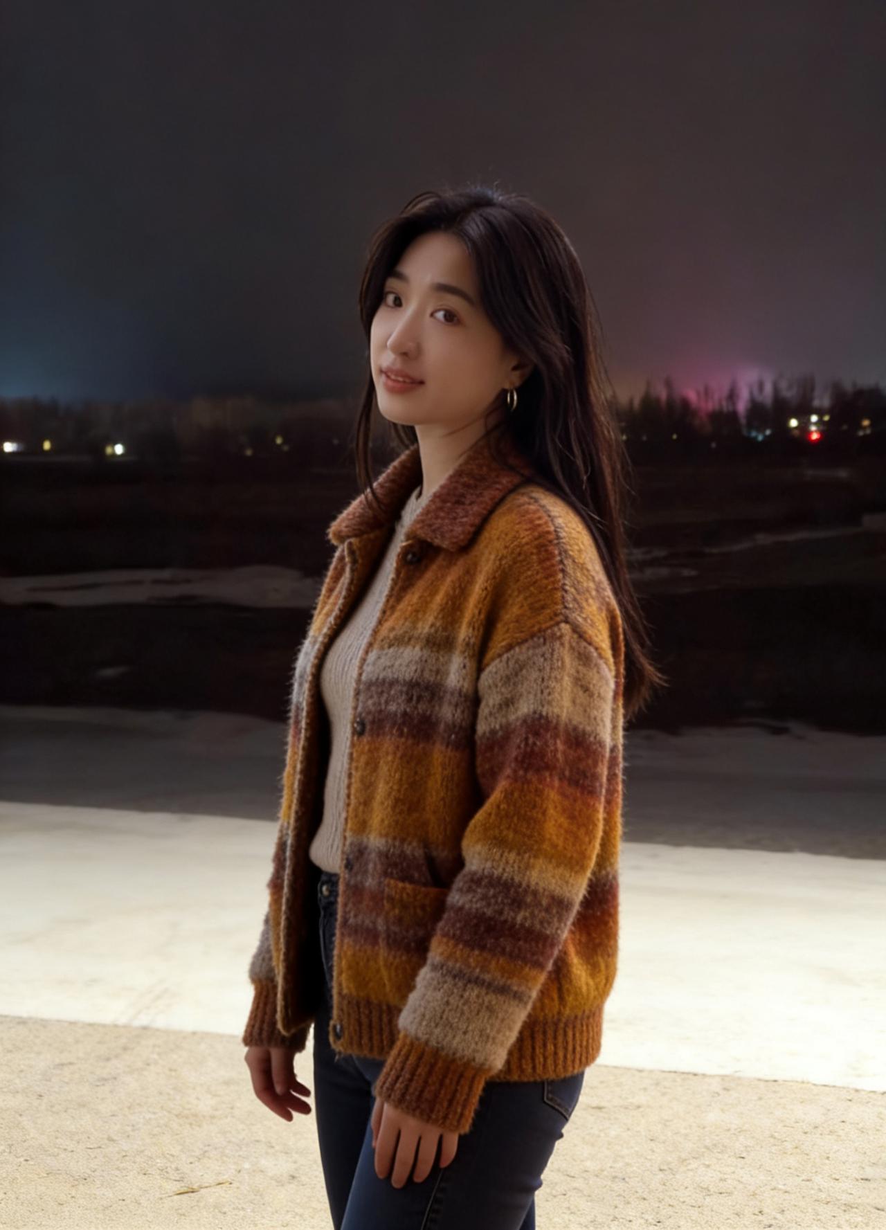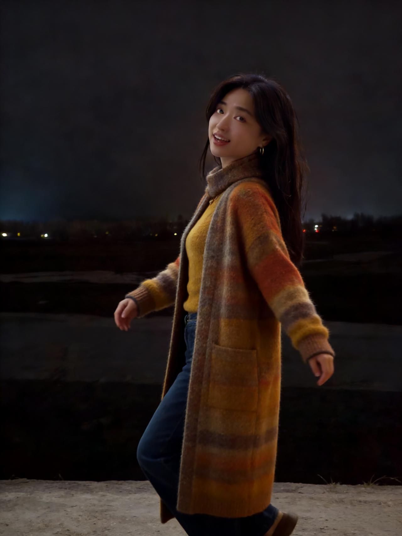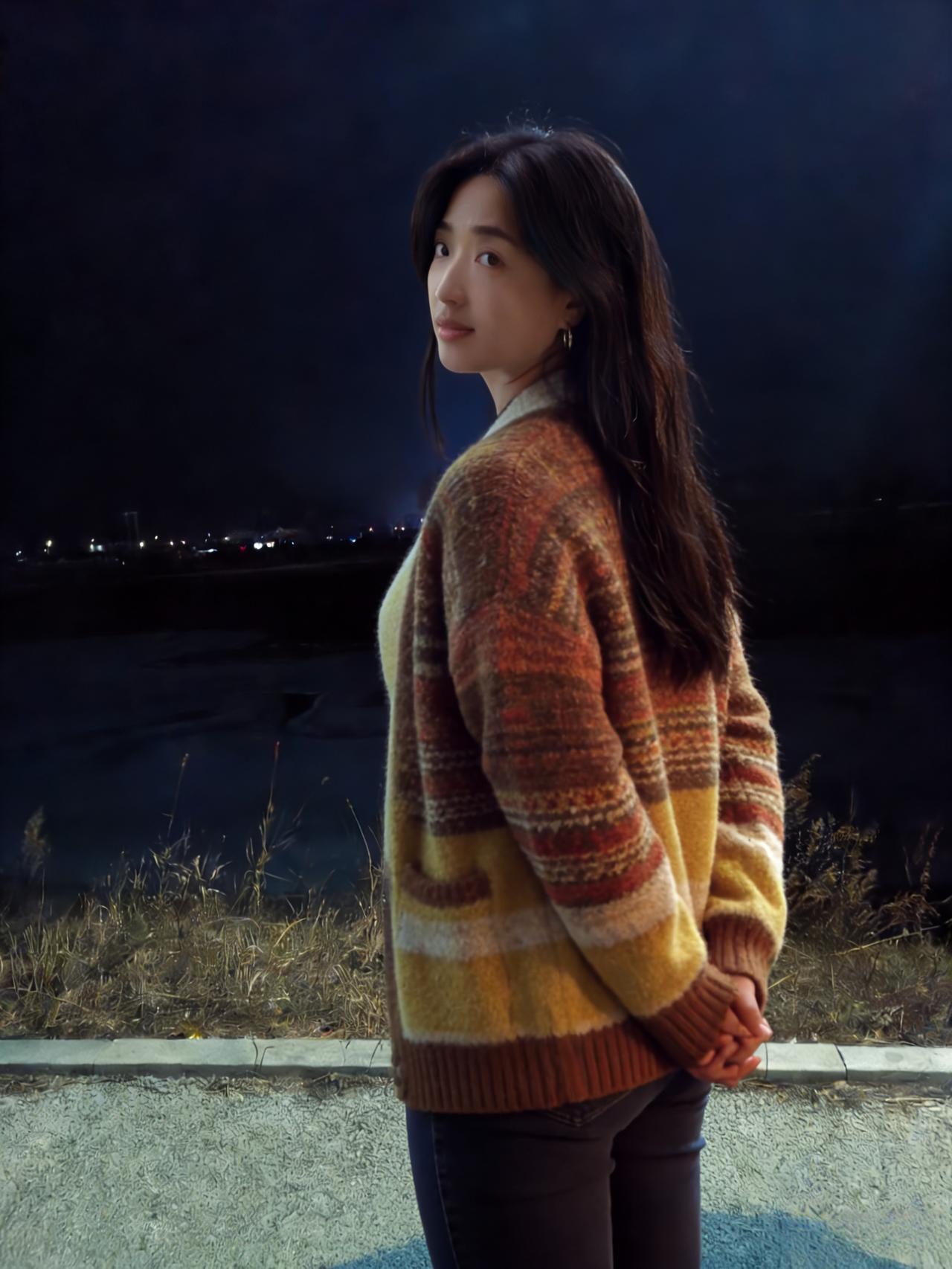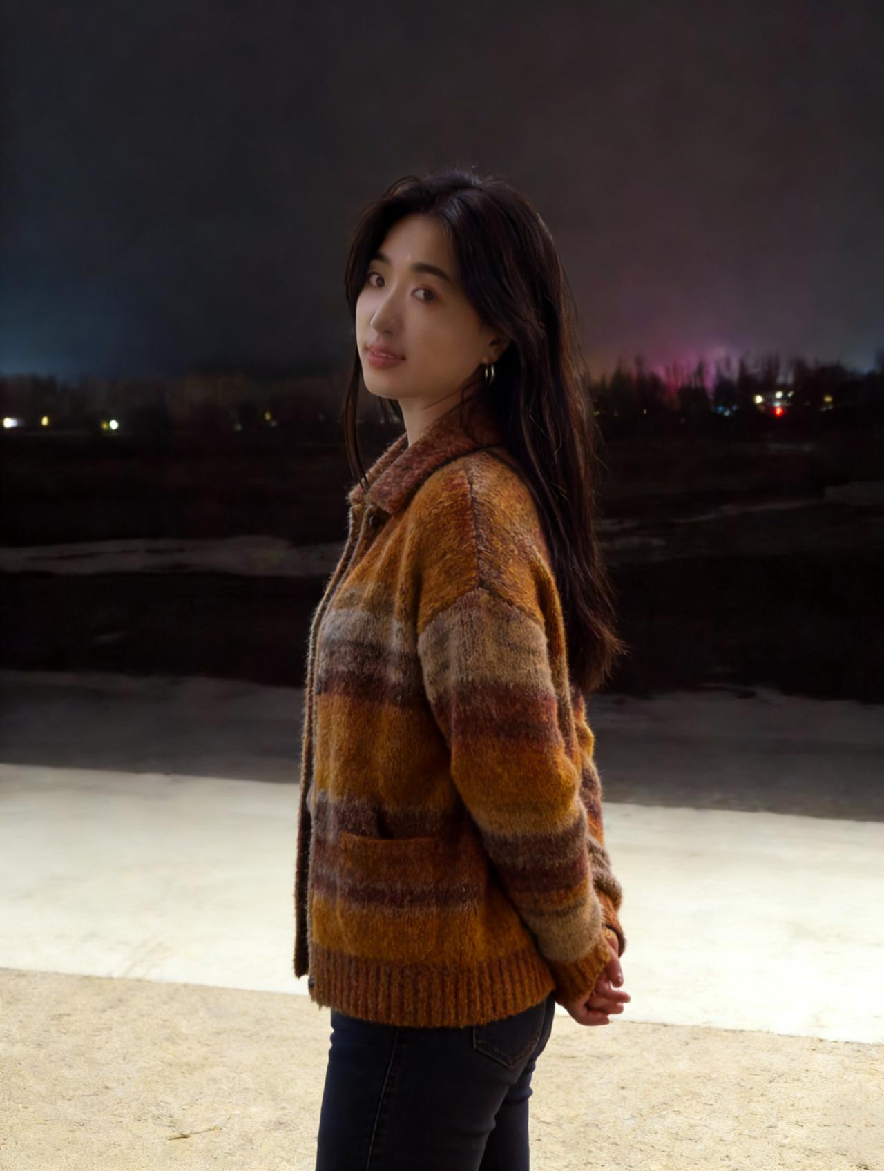 夜满郊原寒色重,佳人独立霜风。焦糖织袄衬颜红。 眸光凝远岫,笑意荡晴空。 … 莫道冬宵无暖意,一颦一笑情浓。疏灯遥映影玲珑。 晚风知惜玉,绕袂不教逢。