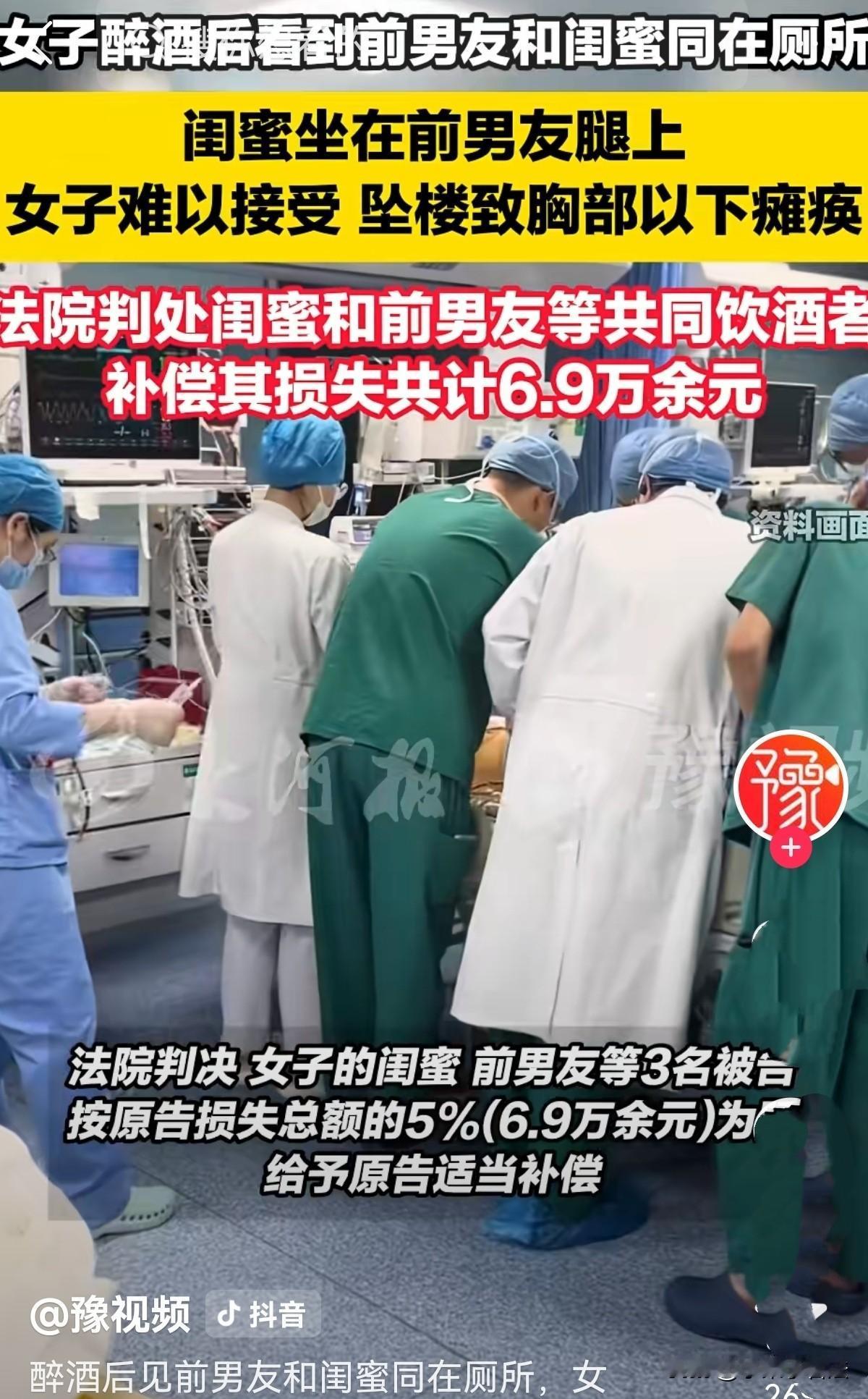 河南宁陵,一女子与前男友分手一个月后,应邀与闺蜜、一朋友喝酒,其前男也在场。期间气氛很好,直喝至凌晨3点左右,女子喝多了,3人送其至出租屋,她倒在卧室就睡,期间她迷糊糊去上厕所,竟发现前男友与闺蜜都在卫生间,闺蜜坐在前男友腿上,女子一时无法接受,情绪上头,竟爬上楼顶,失足坠落导致胸部以下瘫痪,而后,她将前男友、闺蜜及另一位朋友告上法庭,索赔43万,法院是这样判的! 王某和薛某从年初开始相恋,相处大半年后,因为一些矛盾没能磨合,最终选择了分手。 虽恋情结束,但王某心里始终没放下。还经常拉着自己的闺蜜郭某,一起跑到薛某家附近等他,希望能有复合的机会。 郭某和另一个朋友李某也是前男友的共同朋友,王某经常约他们一起玩或是吃饭,让他们叫上薛某。 2024年10月19日晚上,郭某主动联系了朋友李某,说想约着见个面,薛某也恰好在场,也就一同去了。 结果郭某还带着王某一同来的,4人坐在一起聊天说地,氛围融洽,吃吃喝喝,时间过得很快,直至凌晨3点,王某已醉的一塌糊涂。 3人考虑到王某喝多了,便特意找了代驾,一起把她送回了出租屋。 到家后,王某酒劲上头,栽倒在卧室床上就睡了。郭某、薛某和李某则留在客厅里,继续闲聊了一会儿。 谁也没料到,平静的表象下,一场风暴正在酝酿。 休息了大概一个小时,晕晕乎乎的王某从卧室出来,想去卫生间。 可当她推开门时,眼前的场景让她瞬间清醒又崩溃,自己的闺蜜郭某,竟和刚分手一个月的前男友薛某一起在卫生间里,郭某竟坐在前男友大腿上。 在醉酒和情绪激动的双重作用下,王某认定两人举止亲密,双双背叛了自己,一时无法接受。 王某没质问一句,转身就往外跑。薛某一看情况不对,心里咯噔一下,下意识地跟着追了上去。 等他冲到阳台时,王某已爬上了楼梯,跨过了窗户,一只脚都快要越过围墙了。 薛某急得大喊别冲动,伸手死死拽住了王某的双手,还不停呼喊着其他人救人。 可王某当时情绪已完全失控,加上酒精的作用,一个劲地挣扎。薛某的体力渐渐不支,最终没能拉住她,眼睁睁看着王某从二层楼顶坠落到了一楼地面,发出沉闷的声响。 郭某和李某赶紧跑下楼,看到躺在地上一动不动的王某,吓得魂飞魄散。 几人连忙拨打急救电话,郭某垫付了200元救护车费,薛某也在后续陆续拿出11000元,用于王某的治疗。 可命运并没有眷顾王某,经医院全力抢救,她虽保住了性命,但落下了终身残疾,双手大部分肌瘫,双下肢完全截瘫,从此需要完全护理依赖,吃喝拉撒都得靠别人照顾。 好好的人变成这样,王某和家人都无法接受。她认为,这场悲剧的根源是郭某和薛某的行为刺激了自己,而李某作为共同饮酒人,也有不可推卸的责任。 于是,王某将郭某、薛某、李某三人一起起诉到法院,一开始索赔51万余元,后来又变更为43万余元,要求三人承担侵权赔偿责任。 庭审现场,各方说法不一,争执不下。 王某坚持认为,自己是因为看到郭某坐在薛某腿上,受到巨大刺激才坠楼的,三人必须为自己的损失负责。 可郭某却矢口否认,当晚几人送王某回家后,自己根本没和薛某有过亲密举动,更没坐在他腿上。 而且是她和李某离开王某住处时,走到楼下时,才发现王某躺在地上,自己已尽到了安全护送义务,不该承担赔偿责任。 薛某和李某也辩称,事发当天没有任何人劝酒,也没有发生过任何言语冲突。送王某回家后,是王某主动要求薛某留下聊天的。 王某发现郭某和薛某在卫生间时,卫生间的门是敞开的,两人只是在聊天而已。 薛某看到王某跑向阳台,已第一时间施救,王某的坠楼是她自己酒后不冷静导致的,和三被告没有任何因果关系。 《民法典》第1165条第一款规定:行为人因过错侵害他人民事权益造成损害的,应当承担侵权责任。 《民法典》第1173条规定:被侵权人对同一损害的发生或者扩大有过错的,可以减轻侵权人的责任。 本案中,三被告将醉酒王某安全送至其出租屋,王某回家后倒头就睡,并未再饮酒。 说明三被告已履行共同饮酒人必要安全护送与照顾义务,无劝酒、放任危险等过错。 王某中途去厕所,看到闺蜜及前男友同在厕所。便情绪失控自行坠楼,其损伤是自身不冷静行为导致,与三被告无直接因果关系,故三被告无需承担侵权责任。 《民法典》第6条规定:民事主体从事民事活动,应当遵循公平原则,合理确定各方的权利和义务。 《民法典》第1186条规定:受害人和行为人对损害的发生都没有过错的,可以根据实际情况,由双方分担损失。 三被告虽无侵权过错,但与王某存在共同饮酒的事实,王某遭受双下肢截瘫,依照公平原则及公序良俗精神,共同饮酒人应当给予适当补偿。 法院认定王某的相关损失138万余元,被告承担5%的适当补偿。 最后法院判决:闺蜜郭某补偿2%,前男友薛某补偿2%,朋友李某补偿1%,共计6.9万元。 对此您怎么看?