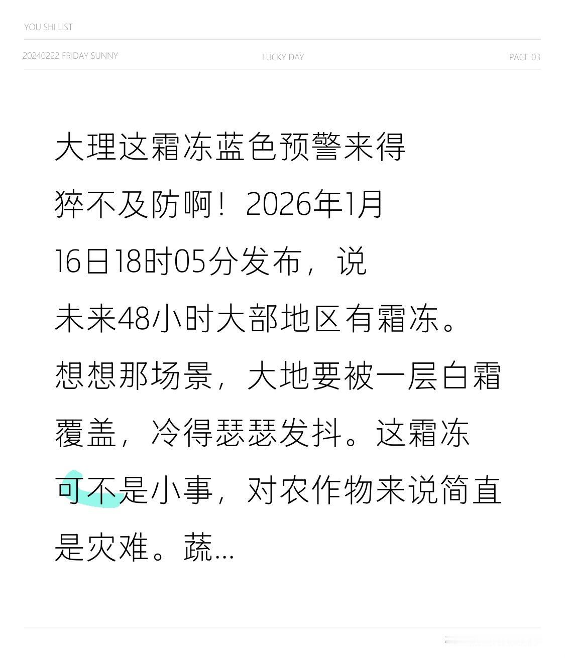 大理这霜冻蓝色预警来得猝不及防啊!2026年1月16日18时05分发布,说未来48小时大部地区有霜冻。想想那场景,大地要被一层白霜覆盖,冷得瑟瑟发抖。 这霜冻可不是小事,对农作物来说简直是灾难。蔬菜、水果啥的,可能会被冻坏,农民伯伯的辛苦可能就白费了。居民也得做好防护,厚衣服、围巾、手套都得安排上,不然出门就得被冻成“冰雕”。希望大家都能重视起来,把该做的防护工作做好,平安度过这寒冷的48小时。 大理天气预报 大理气温 大理每日云图 大理天气实况