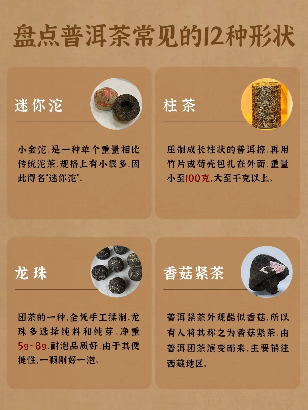 普洱紧茶外观酷似香菇,所以有人将其称之为香菇紧茶,由普洱团茶演变而来,主要销往西藏地区。