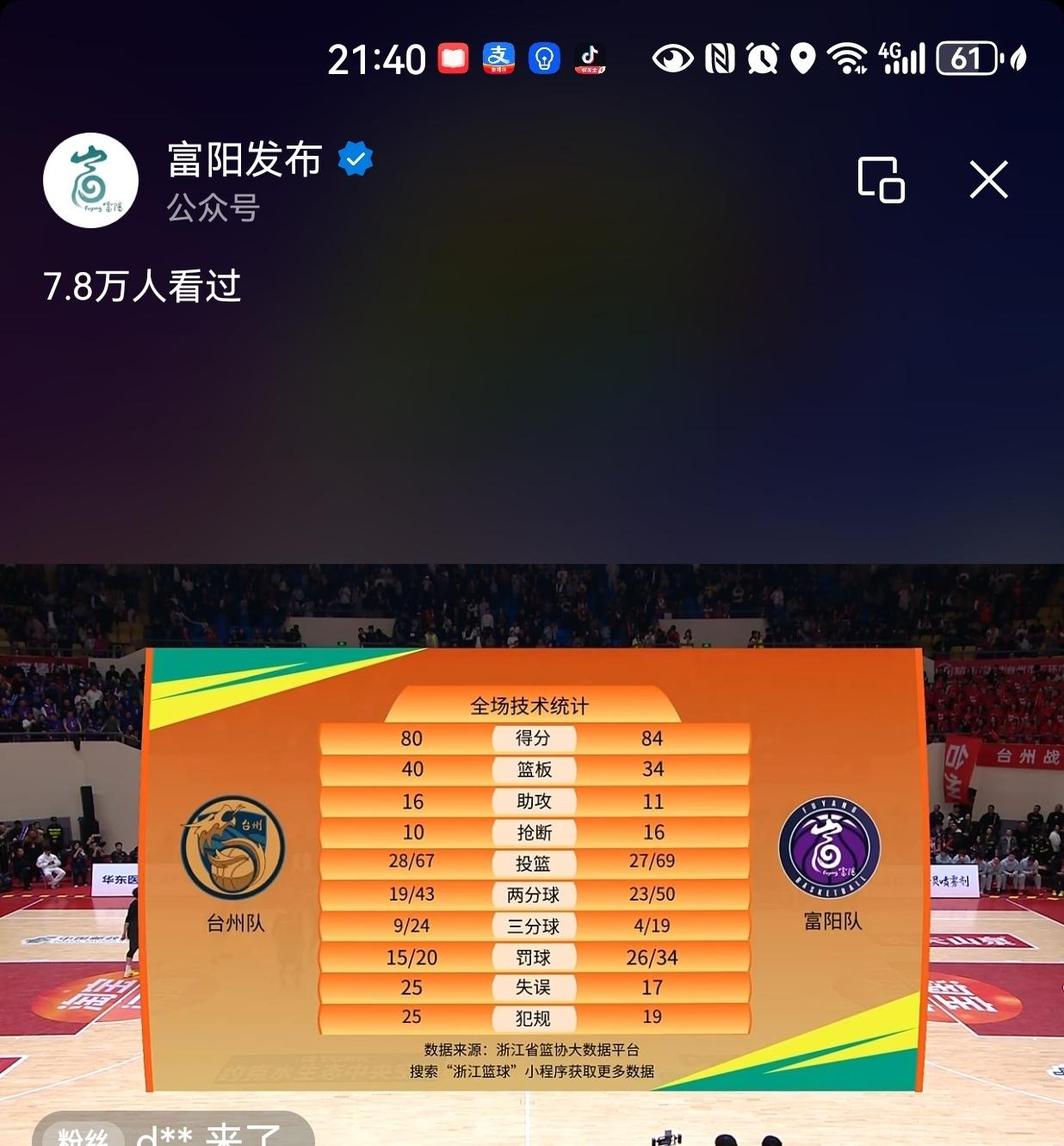 这一刻,县大队——富阳队终于又以84:80的成绩又赢了台州队! 🎉🎉🎉?