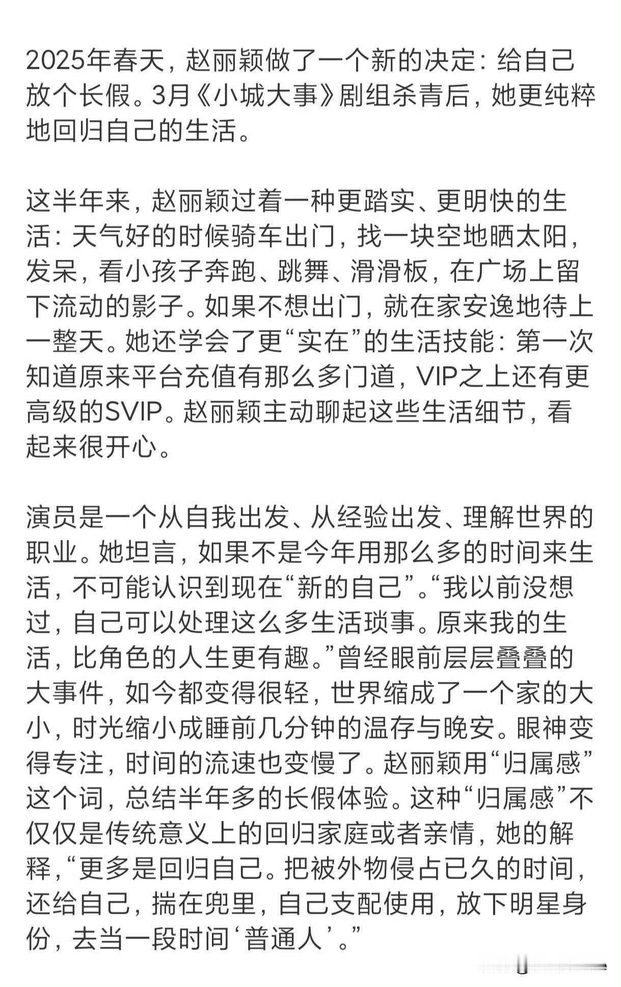 1月16日,赵丽颖在2025年春天做了一个决定,放下艺人身份,去做一段时间普通人 赵丽颖在拍完《小城大事》后给自己放个长假,这大半年的假期,赵丽颖大部分都在家陪家人带孩子,处理家中琐事,闲暇时骑车出门晒太阳发呆,居家时研究学习生活新技能 赵丽颖用归属感来总结自己这大半年的长假体验,把现在的自己视作新的自己! 从赵丽颖的分享中看得出来,她这段假期过的很充实与愉快,也期待新的赵丽颖!