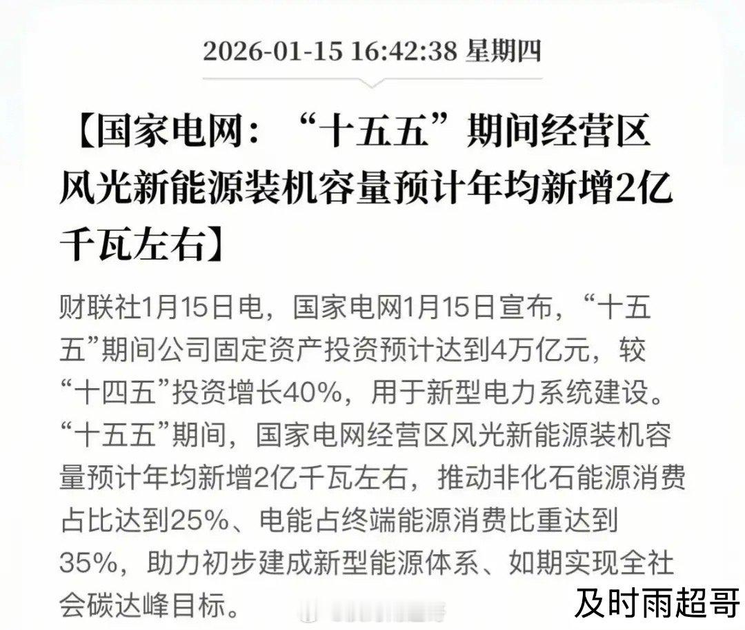 史诗级利好!4万亿电网投资引爆!变压器产业链彻底沸腾,这几家龙头是要起飞了?最新消息:国家电网“十五五”4万亿投资重磅落地,较“十四五”暴增40%!年均新增2亿千瓦风光装机、特高压跨省输电能力提升超30%,新型电力系统建设全面提速。相关概念龙头代表有哪些?变压器作为电网核心设备直接受益,特变电工以4.09%市占率稳居国内第一,许继电气、保变电气紧随其后;出口端伊戈尔、思源电气海外收入占比领先,中国西电、金盘科技等在固态变压器领域已率先突破。随着电网投资加速落地,变压器产业链龙头有望迎来量价齐升的黄金期。“十五五”电网投资是长期规划,项目招标、建设存在时间周期,短期业绩兑现能力有限,切勿盲目预判业绩增速。理财有风险入市需谨慎。