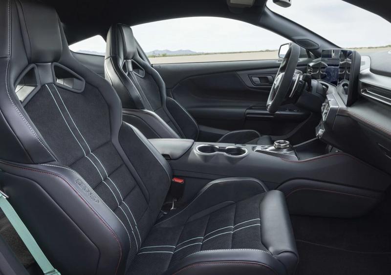 MustangDarkHorseSC采用MustangGTD同款平底方向盘,带12点方向标记和性能控制按钮,配以Alcantara面料与碳纤维装饰。赛道性能包提供了Recaro的皮革纤维座椅,搭配太空灰或青柠色装饰点缀,并以储物架取代后排座椅。