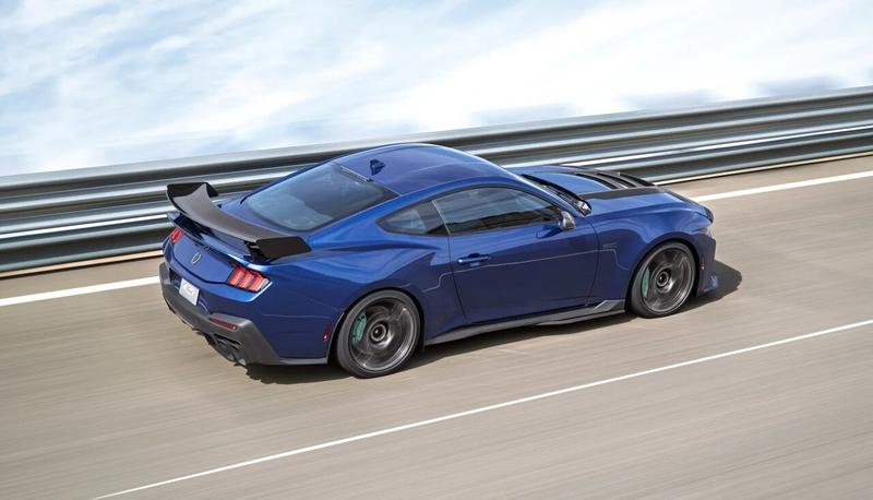 全新前脸设计改良了制动冷却,而带有标准机盖锁扣和大尺寸通风口的新铝制发动机盖则提升了动力系统冷却效率并有助于管理前端空气动力学。移除发动机盖通风口的导雨槽后,其产生的下压力是标准MustangDarkHorse发动机盖通风口的2.5倍,同时开口面积增大5倍。