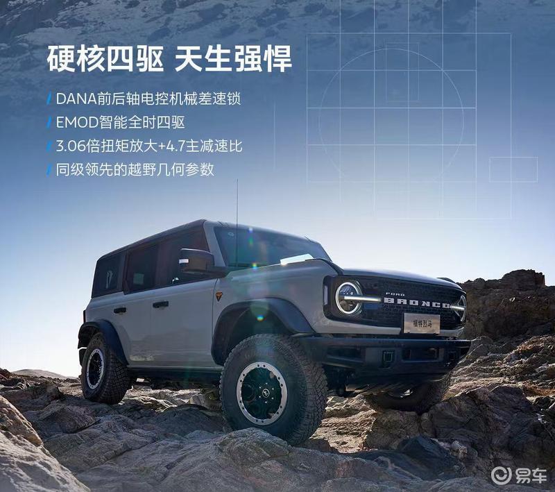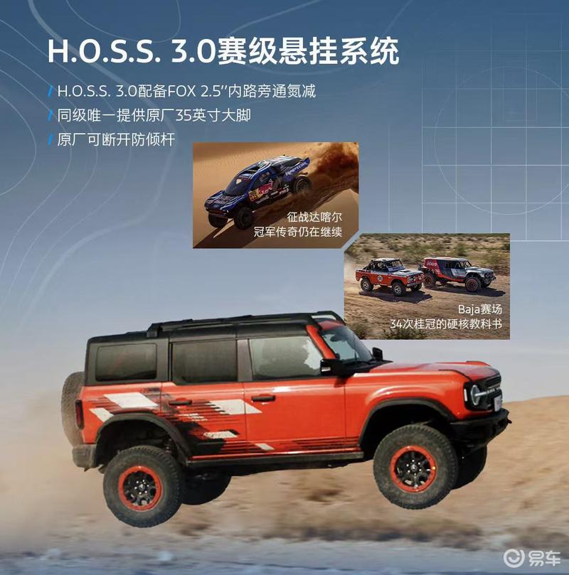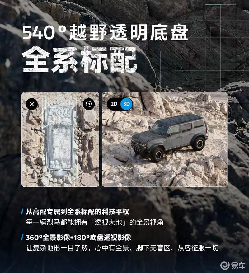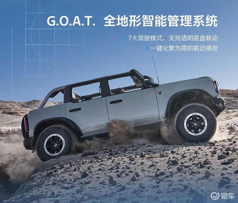 在底盘和越野配置方面,新车采用前双叉/后五连杆悬挂,并搭载EMOD智能全时四驱系统、两把差速锁、前防倾杆断开功能、H.O.S.S3.0赛级悬挂系统以及G.O.A.T全地形智能管理系统,并全系标配540°透明底盘。