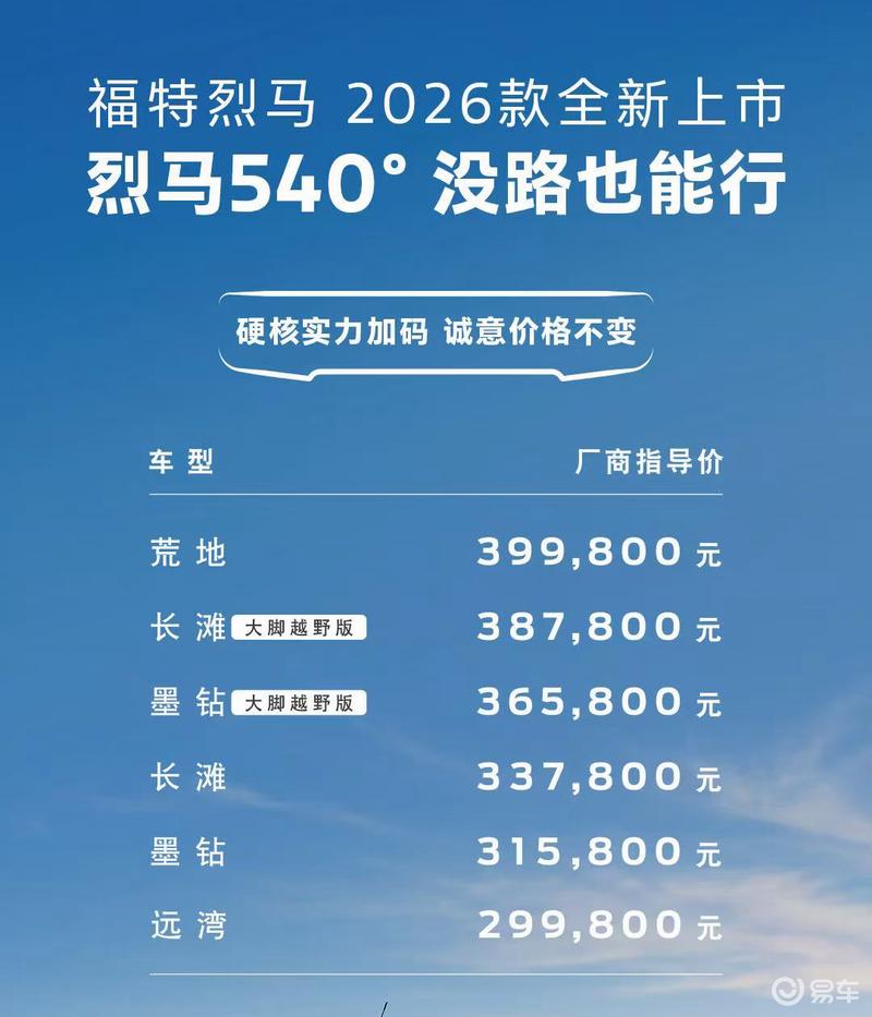 易车讯1月16日,2026款福特烈马正式上市,新车共推出6款车型,售价29.98-39.98万元。作为年度改款车型,新车新增全系标配540°越野透明底盘系统,并配备H.O.S.S.赛级悬挂、G.O.A.T.全地形智能管理系统和全系四驱。