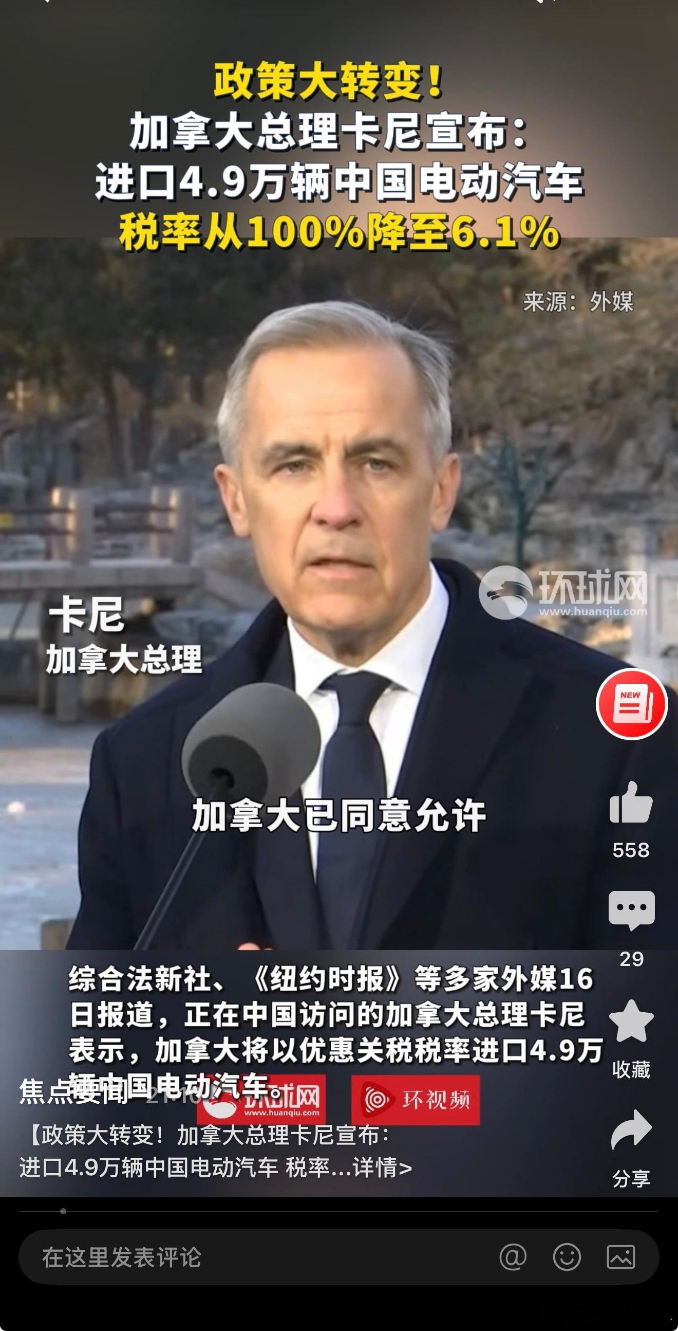 a股新能源汽车 【政策大转变!加拿大总理卡尼宣布:进口4.9万辆中国电动汽车 税率从100%降至6.1%】据环球时报援引综合法新社、《纽约时报》等多家外媒1月16日报道,正在中国访问的加拿大总理卡尼表示,加拿大将以优惠关税税率进口4.9万辆中国电动汽车。《纽约时报》称,加拿大将降低部分中国电动汽车的关税,这一重大政策转变是加拿大总理卡尼在对北京进行“具有里程碑意义”的访问期间宣布的。此前在2024年,在美国拜登政府的要求下,加拿大对中国电动汽车征收100%的关税。(环球时报) 丽水·遂昌金矿国家矿山公园