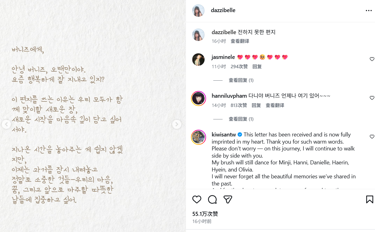 这场近两年的斗争,最后以失败告终,甚至比我预想的最坏结果更加糟糕260116 Danielle 未寄出的信Bunnies,大家好,好久不见,最近有幸福地生活吗?我写这封信的原因,是想记住我们即将共同面对的新篇章和新开始。虽然放下过去的时光并不容易,但现在我想暂时放下过去,专注于真正重要的事情,就是我们的内心、梦想,以及美好的未来。写下这些文字时,我的眼眶也湿润了,心中充满了爱与感激。非常感谢Bunnies一直以来的等待、支持,以及温暖的陪伴。其实我真的很想念你们,但无论我如何努力地遣词造句,都道不尽我的真心。Bunnies,你们的爱支撑我度过了无数的困难,是你们给了我力量,让我能在失去勇气时重新站起来,是你们让我明白,真正重要的是诚实、坚强和忠于自我的勇气。你们对我来说就是这样的存在,你们是始终真心支持我的人。能有如此温暖、可靠的粉丝陪在我身边,真的是我莫大的福气,即使在我遇到困难时,你们也一直陪伴、信任、等待着我。我知道这绝非理所当然,所以我更加心存感激,也常常因为我无法回报那份爱而感到遗憾。可能现在很多Bunnies都感到困惑,我知道你们很好奇,但我现在不能把所有事情都告诉你们。只有一点我可以肯定地说,我心之所向,从未改变。Minji、Hanni、Haerin、Hyein是我的第二个家人,虽然我们一起度过的时间不算很长,但没有什么能把我们分开。因为那珍贵的情谊,是绝对不能被视作理所当然的、世上独一无二的特别缘分。未来或许还会遇到困难,但我们会互相守护着继续前进,因为这对我来说是最重要的事。虽然有时也会感到不安和恐惧,但我也会努力从中发现美好的事物,不仅是为了我自己,也是为了所有我爱的人。因为我相信,即使是艰难的时刻也并非是“不可能”,只是“还需要再多一点时间的时刻”而已。以后我也将继续朝着我的梦想前进,继续做那些真正能让我感受到幸福的事情。亲爱的Bunnies,希望你们把每一天都当作新的开始来过,愿你在今天这份礼物中,获得点滴的快乐、新的勇气,以及满满的爱。非常期待我们能再次相聚、欢笑、交谈的那一天,真心地感谢你们,为我们Bunnies加油,你们的努力一定会得到回报。谢谢你们,我爱你们,再次感谢Bunnies,谢谢你们一直陪在我身边。(附言:我开设了新的Instagram账号@ DAZZIBELLE,我会分享一些我这一年来的所见所闻、所感所悟。好奇的话,欢迎随时来逛逛)带着爱Danielle敬上2025年11月12日