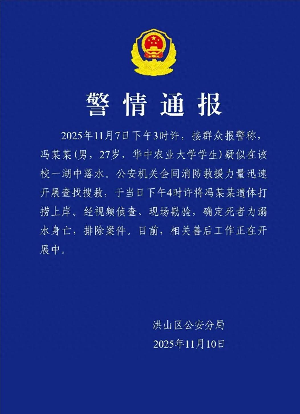 针对此事,华中农大校方作出回应,否认了 “冯同学因做实验落水” 的网传说法,称已成立专项工作组调查此事,善后工作正在推进。但对于网友最关心的 “湖岸为何长期无防护”“隐患排查为何不到位” 等核心问题,校方暂未给出具体解释,这也让部分网友表示 “期待更透明的调查结果和切实的整改措施”。
