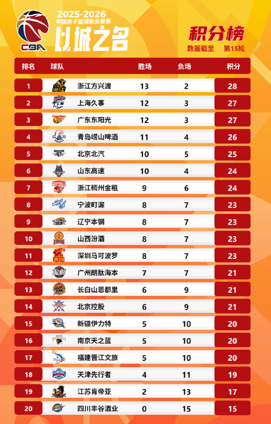 CBA官方更新积分榜:广厦男篮高居榜首、上海&广东分列二三
