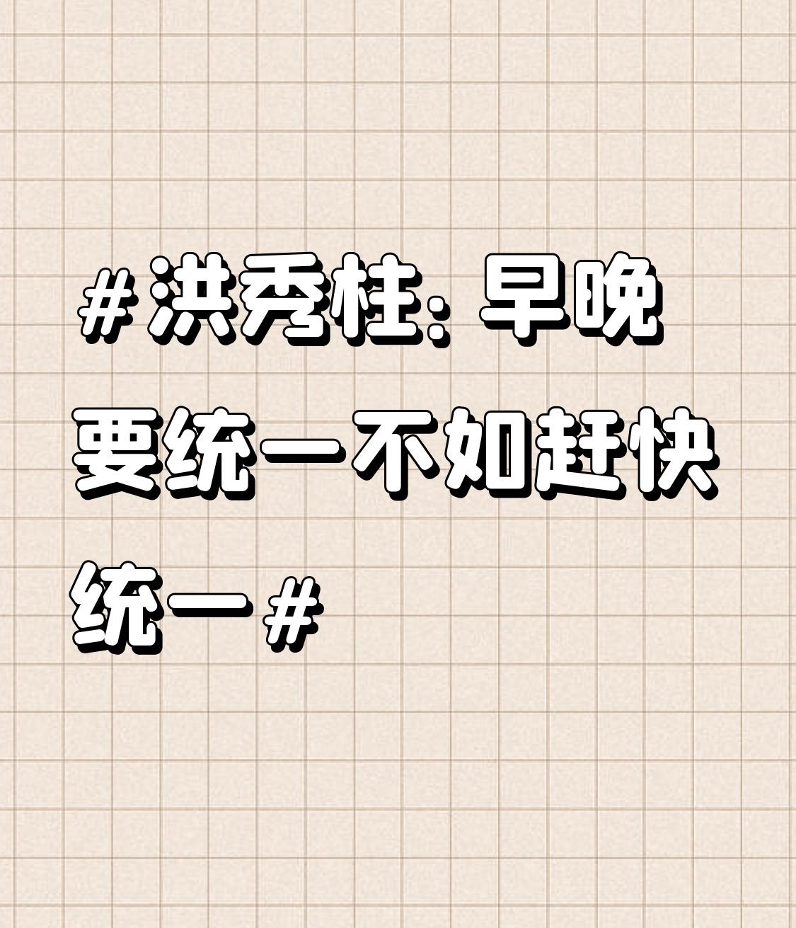 洪秀柱:早晚要统一不如赶快统一 洪秀柱这话真是说到心坎里了!“早晚要统一不如赶快统一”,太有道理。台湾本就是中国不可分割的一部分,这是铁打的事实,也是历史必然。 想想这些年,因为两岸未完全统一,产生了多少不必要的麻烦。民进党当局搞“谋独”那一套,把台湾民众拖进不安的漩涡,还在国际上闹笑话。而统一能让台湾搭上大陆发展的快车,共享发展红利。 早统一早受益,无论是经济、文化还是社会层面,都能给台湾带来新的机遇。期待统一那一天早日到来,让两岸同胞携手共创更美好的未来。