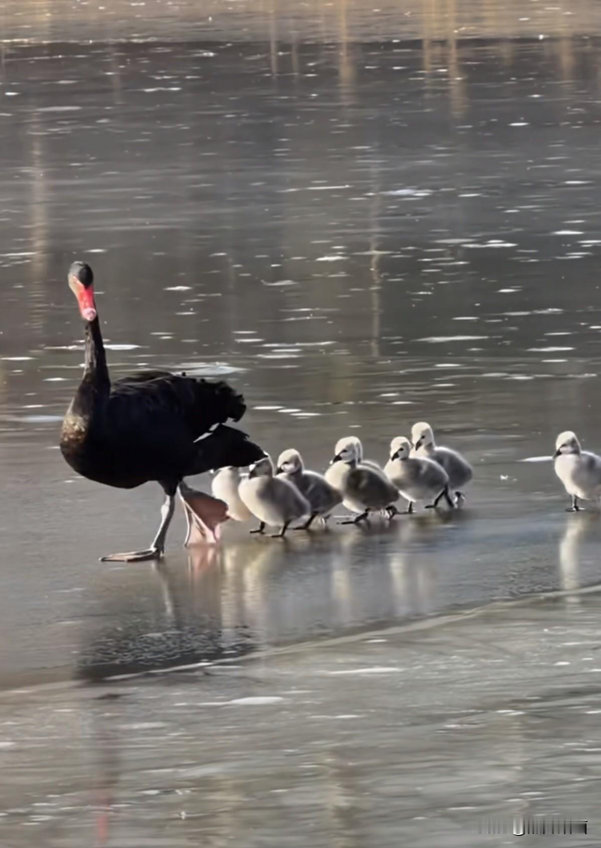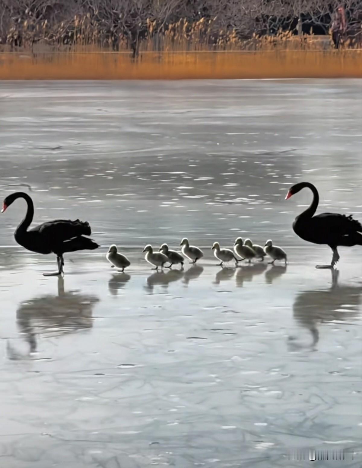 今年冬天的不同虽然北京的冬天好冷,但是在北京圆明园曲苑凤荷景区,看见暖心的场景,黑天鹅豆花和垚垚带着它们的孩子们一家,在冰面上出来散步好温馨的场面。