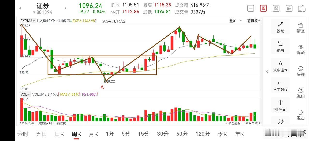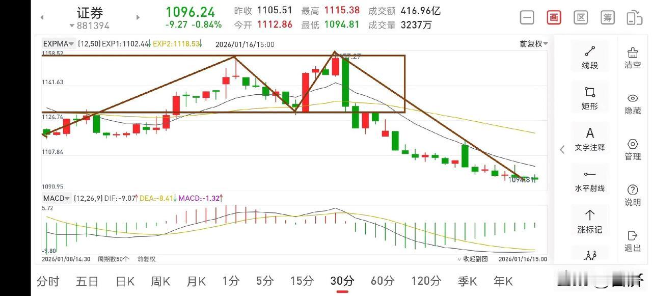 下周证券板块展望(2026.1.17) 本周在各种利好加持下,券商板块还是下跌了2.38%,上涨没有持续性,操作难度较大,虽然如此,此处就是一个底部震荡区间磨底,只要是在底部区间布局,都是正确的,目前正在收尾阶段,只是收尾有点拖拉,略有遗憾。 1.从周线图一上看,由于上周出现了量价异常,这在上一篇周评中讲过,而这种异常是要化解的,所以这周出现了震荡下行走势,目前这种异常已经得到化解,下周有望迎来震荡上行走势,预计走势会比较墨迹,但只要是上行走势,都是需要耐心持股待涨的。 2.从日线图二上看,目前正在回踩macd零轴,从而形成日线二买,而这个二买回踩有点深,可能会影响后面上涨高度,尽管如此,二买的出现,总会带来盈利,只是盈利多少的问题。所以此处是机会大于风险的,可考虑积极参与博弈,耐心持股待涨即可。 3.从30分钟图三上看,这笔回踩macd绿柱已经接近缩至极致,空方力量已经衰竭,所以下周是有望迎来反转的,从而实现震荡上行的走势,但上层定调慢牛,走势或许会比较墨迹,所以上涨过程是很考验耐心的。 4.从5分钟图四上看,周五上午构建三卖后,下午又重新构建了一个5分钟下跌中枢,又再次探底,目前结构上已经形成了趋势背驰走势,所以下周是有反转预期的。 总之,目前并无大的风险,耐心持股待涨即可,无忧!券商指数分析 股票财经