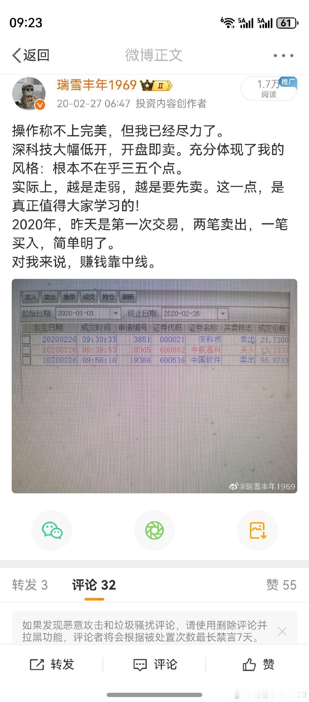 当初的微博,至今无法超越。老鸭愚钝,且越来越觉得江郎才尽。学以致用,知行合一。2020年2月26日,按计划卖出深科技,大幅减仓了中国软件。买了一笔中航高科,后来涨到41元。在科技股上,老鸭自问有一定的发言权。业精于勤,更精于专。当下市场,恐将迎来风格及操盘模式切换。和真诚的朋友一起努力,踏浪前行!