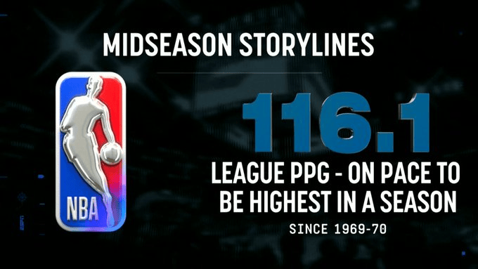 虎扑01月17日讯本赛季截至目前,联盟场均得分116.1分,预计将创1969-70赛季以来单季新高。