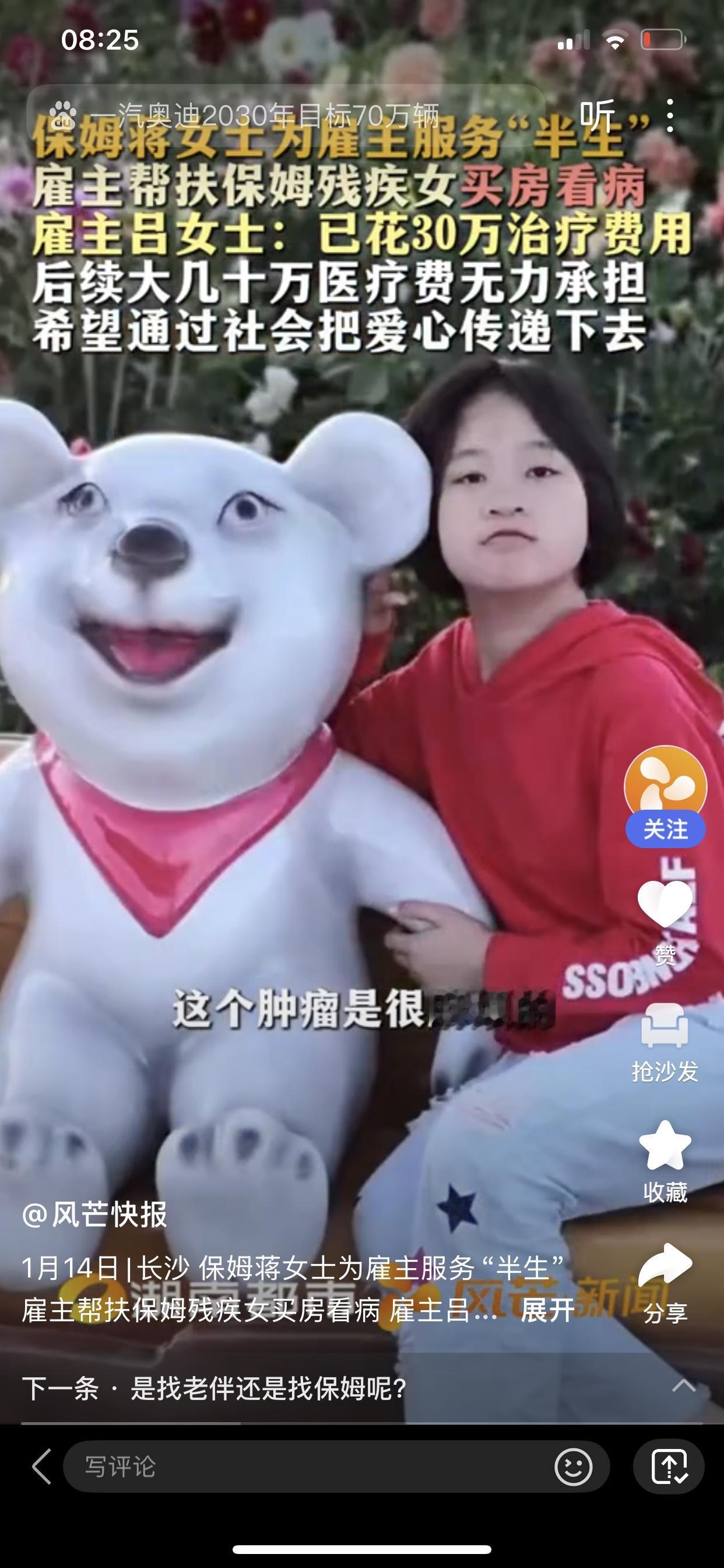 【活菩萨现身!长沙一雇主为保姆重病女儿倾尽所有,网友纷纷点赞“人间大爱”】 在长沙,一段感人至深的故事温暖了无数网友的心。18岁的航航身患重病,急需30多万手术费,但身为保姆的蒋女士一筹莫展。就在她准备放弃时,雇主吕阿姨的行动令人动容:她当场宣布“如果你不救,就赶我出去”,然后用全部积蓄为孙女筹款。 吕阿姨与蒋女士相伴近三十年,从青涩到成熟,她不仅是雇主,更像家人。她曾资助蒋女士买房,支持她的婚姻,面对女儿的病情,更是义无反顾。她翻出全部存款,试图帮航航渡过难关,但巨额的医疗费依然让人心疼。无奈之下,她选择发出求助信息,呼吁社会伸出援手。 这份善良在网络上引发热议:有人说,“这不仅是善良,更是大爱”;有人感叹,“如此无私的行动,令人敬佩不已”。在当今物欲横流的社会,吕阿姨用行动告诉我们,爱与善意可以超越血缘,温暖人心。 她的故事让人深思:在金钱面前,多少家庭选择了放弃?而像吕阿姨这样无私奉献的人,又在这个世界上有多少?他们用实际行动证明,善良并非虚无,而是可以改变生命的力量。 愿航航早日康复,也希望社会多一些像吕阿姨一样的“活菩萨”。因为,有他们在,世界才更有人情味。你会为这样的善行动容吗?你身边又有多少人愿意为他人付出一切?让我们共同传递这份温暖,让善意在这个世界永不熄灭。 感人 慈善 人间大爱