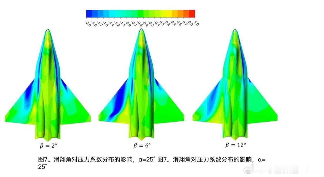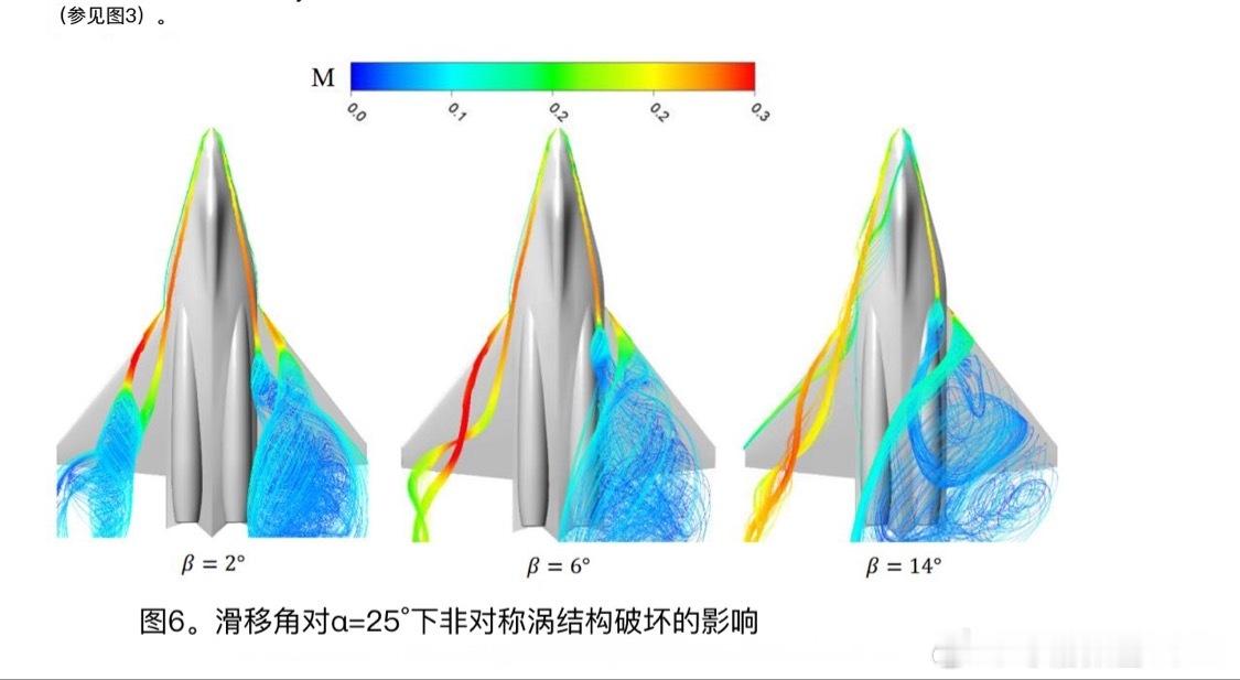 每天认识一件兵器俄苏75战机或于2026年量产 第一版苏75气动布局(很可能2026年首飞)高精度建模风洞测试结果(存档) 这三张图展示了苏75在不同攻角(α)和滑移角(β)下,非对称涡流结构的破裂现象及其对气动特性的影响。以下是对每张图的详细解读:图1:攻角对涡流“破裂”位置的影响该图展示了在不同攻角下,涡流结构的变化情况。 • α = 12°:涡流结构较为稳定,破裂位置较远。 • α = 20°:涡流开始出现不稳定迹象,破裂位置有所前移。 • α = 28°:涡流破裂更加明显,破裂位置进一步前移。 • α = 35°:涡流完全破裂,结构变得非常不稳定。图2:滑移角对α=25°下非对称涡结构破坏的影响该图展示了在固定攻角(α=25°)下,不同滑移角对涡流结构的影响。 • β = 2°:涡流结构相对稳定,破裂程度较低。 • β = 6°:涡流开始出现不对称性,破裂程度增加。 • β = 14°:涡流结构严重破坏,不对称性显著增强。滑移角对压力系数分布的影响图3展示了在固定攻角(α=25°)下,不同滑移角对压力系数分布的影响。 • β = 2°:压力分布较为均匀,无明显压力突变。 • β = 6°:压力分布开始出现不均匀,局部压力突变。 • β = 12°:压力分布极不均匀,局部压力突变显著。综合分析 1、攻角影响:随着攻角的增加,涡流结构逐渐变得不稳定,最终导致涡流破裂。这表明在高攻角下,飞行器的气动性能会受到显著影响。 2、滑移角影响:在固定攻角下,滑移角的增加会导致涡流结构的不对称性增加,进而影响气动性能。同时,滑移角的增加也会导致压力分布的不均匀性增加。⭐️风洞测试结果对苏75气动影响 涡流破裂会导致升力突然下降和阻力急剧增加,影响飞行器的稳定性和操控性。 非对称涡流结构会降低飞行器的横向稳定性,增加滚转和偏航的风险。