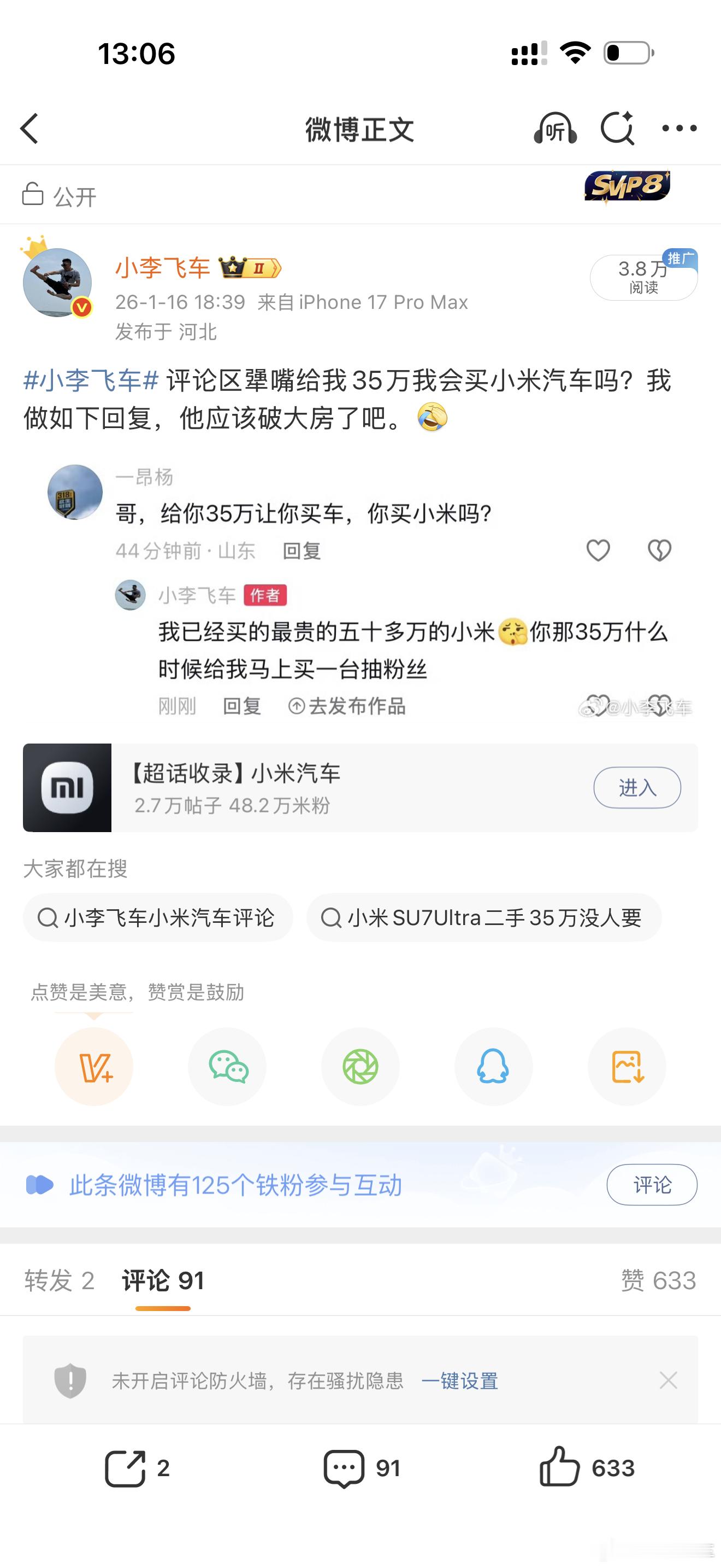 小李飞车 哈哈哈那条给我35万买不买小米汽车的微博讨论很火热,有人他的回答我很满意,我发现ai现在真的挺聪明,给李副总夸爽了