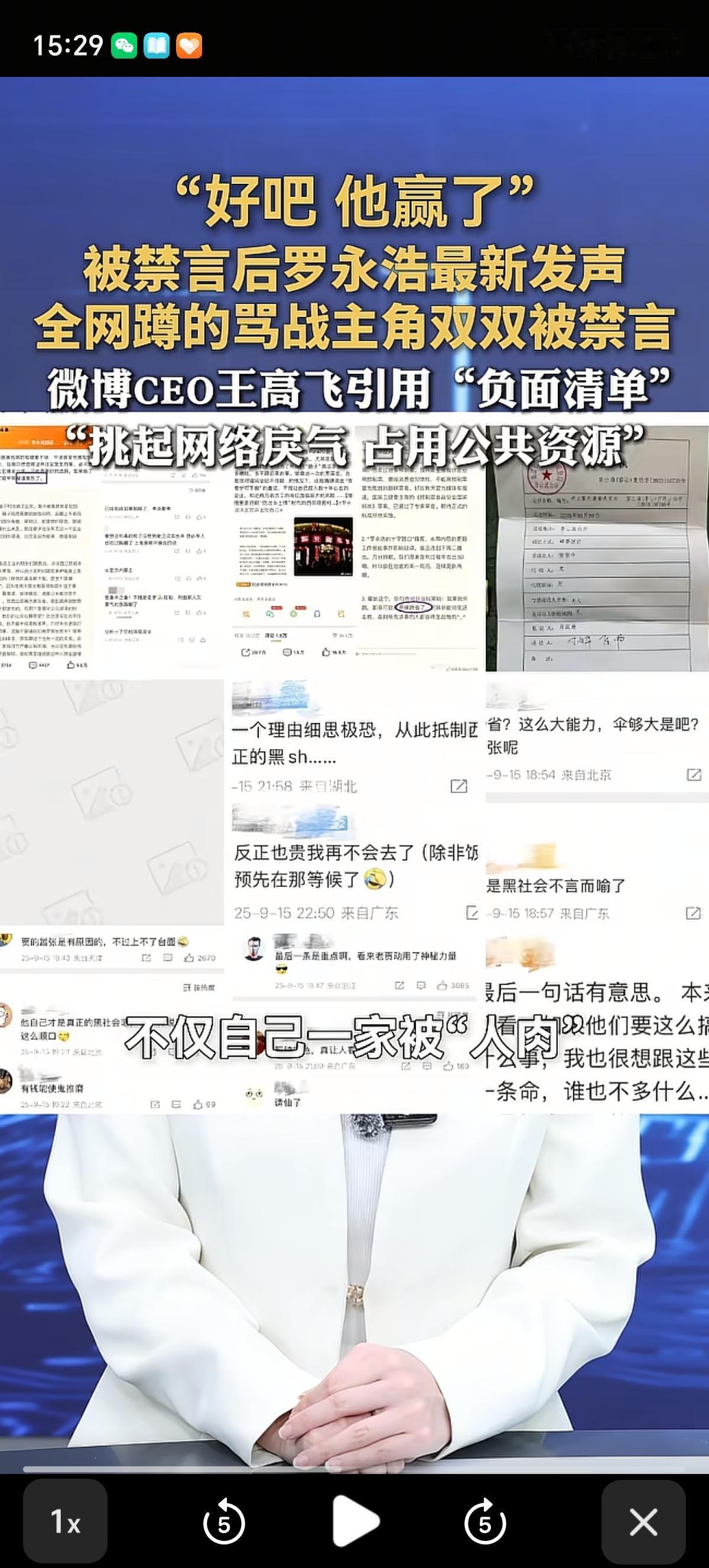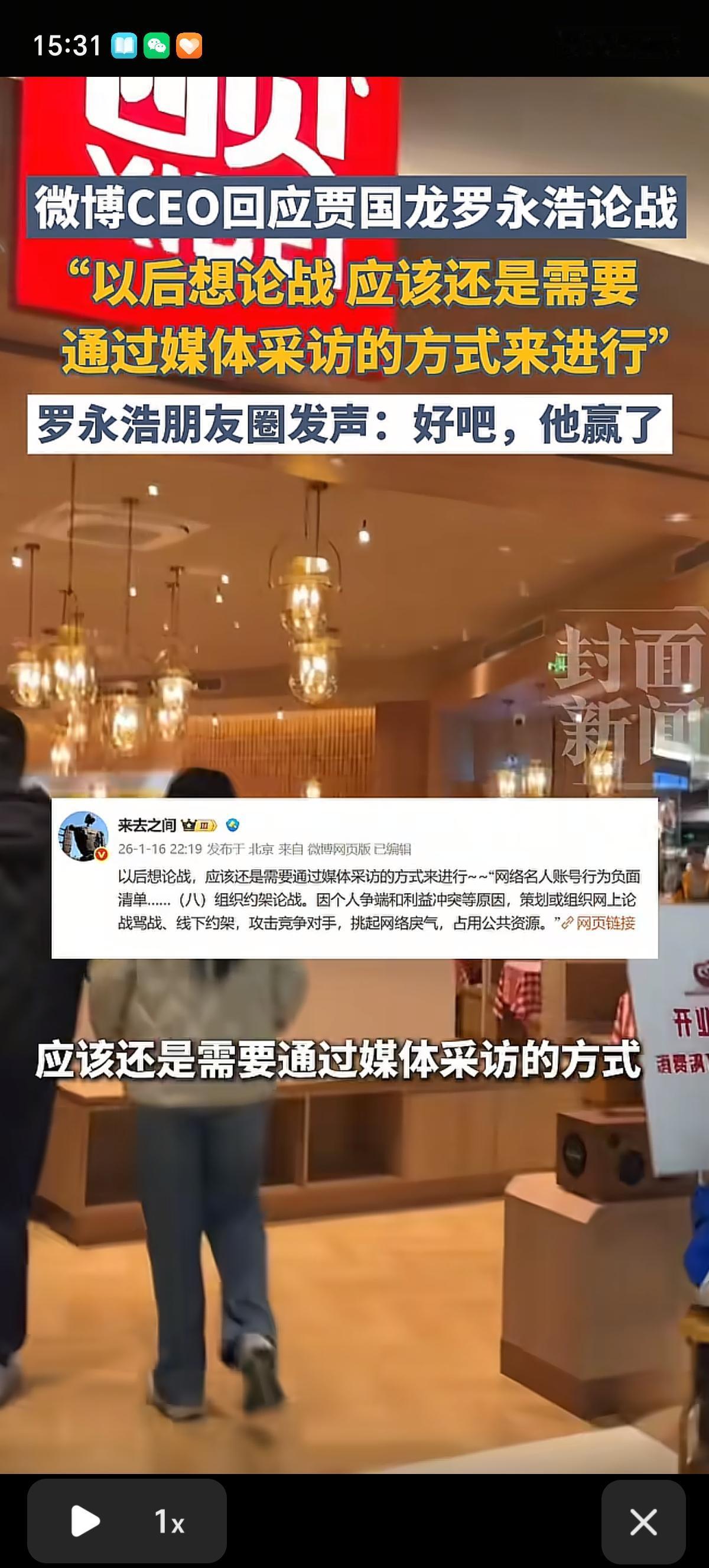 贾国龙凭实力把罗永浩干沉默了,不服不行把,微博大佬王高飞亲自出面给他俩禁言了,让他俩下回论战通过媒体采访的方式来,说他俩挑起网络戾气,占用公共资源,都进“负面清单”了。 罗永浩说贾国龙赢了,赢在哪里了呢,我猜是他俩都不能说话了,被禁止发言了,起码罗永浩回应不了贾国龙了,没人能跟贾国龙吵架了。 贾国龙也不算白忙活,虽然副总和公关都离职跑路了,但李国庆喊话要给他投资了,重新整一个公司,还让华与华也加入过来,还叫西贝,李国庆出钱,贾国龙和华与华出力。 重来一次应该能行,原来的西贝炒不了菜,重开一个,换个地方就能炒菜了。