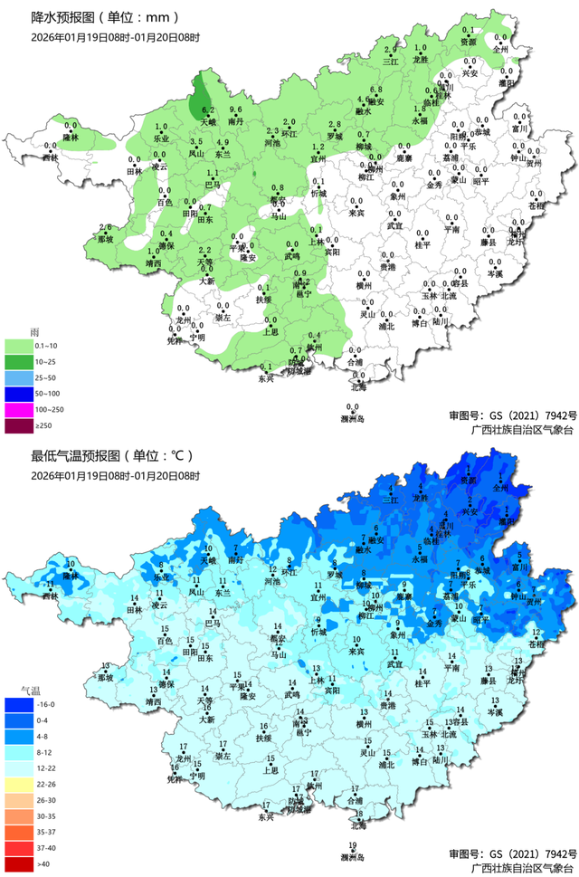 19日晚上到20日白天,桂北、桂西阴天有小雨、局地中雨,其它地区多云到阴天、局地有小雨。桂东北部分地区有冻雨、雨夹雪、雪、冰冻和道路结冰。桂东部分地区有5~6级、阵风7~8级的偏北大风。最低气温:高寒山区-5~1℃,桂东北1~8℃,其它地区8~17℃。