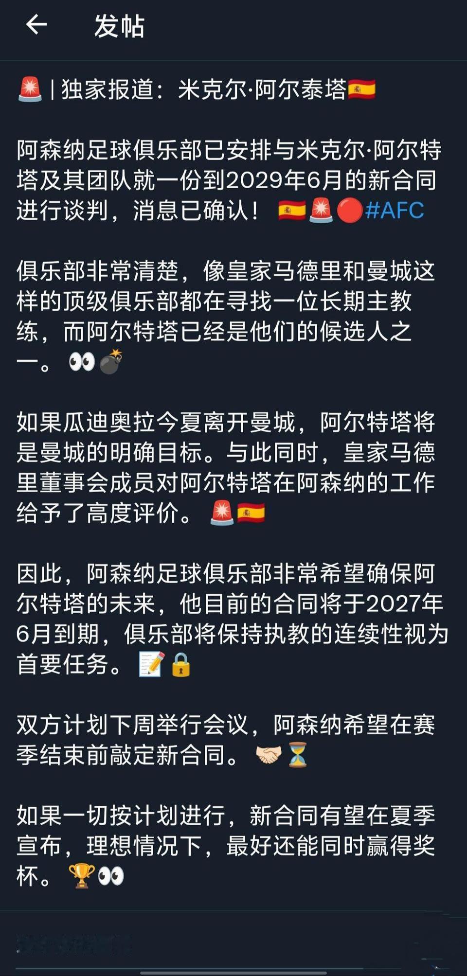 阿森纳怕阿尔特塔被挖走,赶紧续约到2029年?? 阿尔特塔虽然还没拿英超,但是快拿到了。 据说皇马,曼城都对他有意。 这说明阿尔特塔确实执教好,上次皇马看中的还是温格呢,长期执教效果明显。[大金牙]