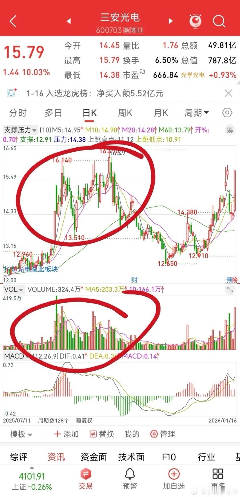 量化混战,三安光电强势涨停,龙虎榜净买入 5.5 亿。这个地方到了前方高点,成交