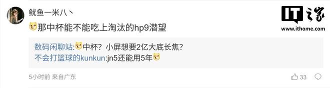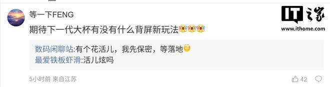 后续有用户在评论区询问:“期待下一代大杯有没有什么背屏新玩法”,博主回复道:“有个花活儿,我先保密,等落地”;另一名用户则询问道:“那中杯能不能吃上淘汰的hp9潜望”,博主则回复道:“中杯?小屏想要2亿大底长焦?”。