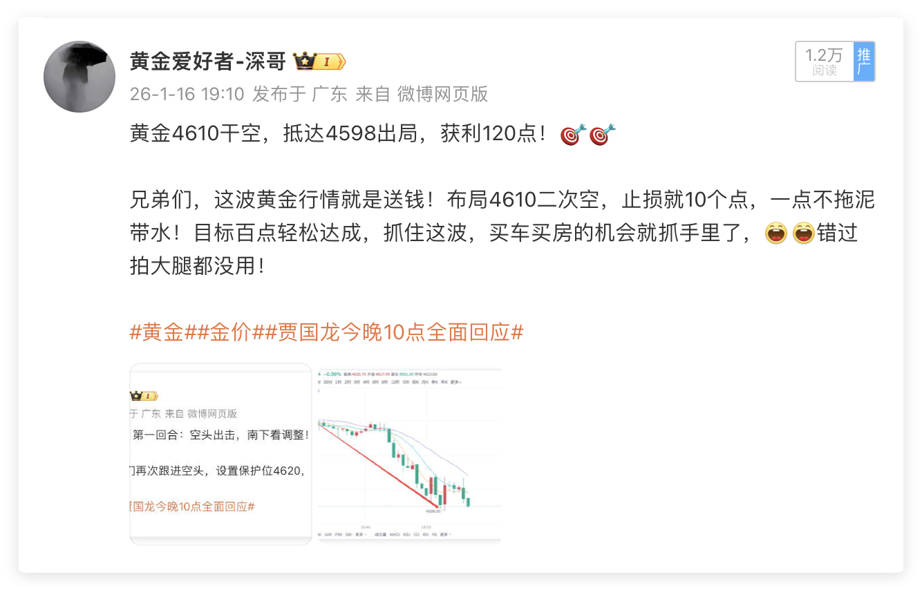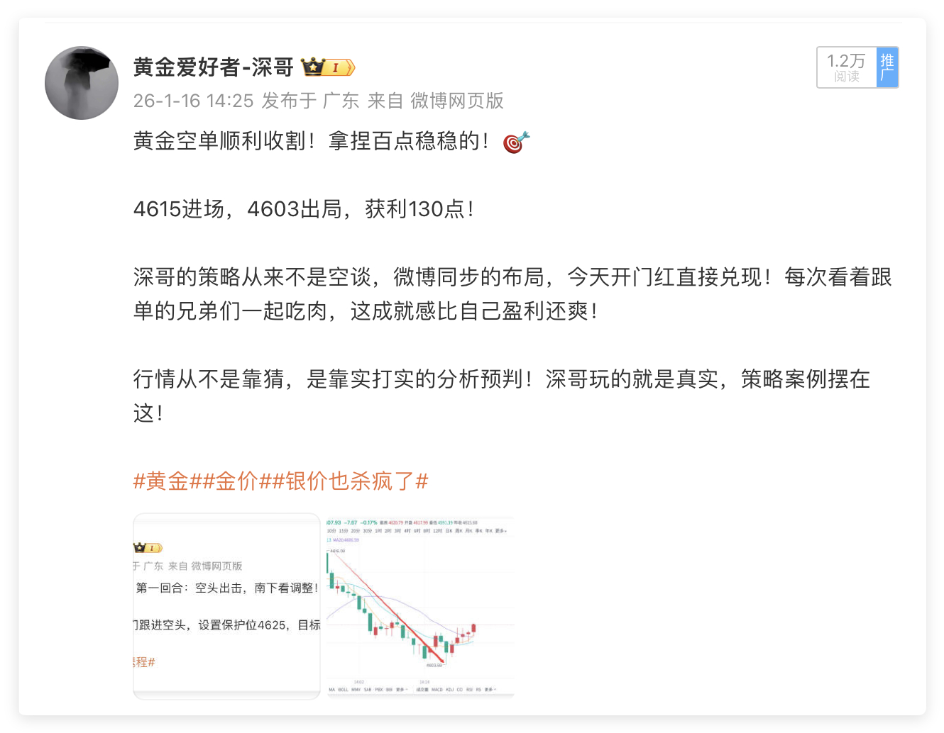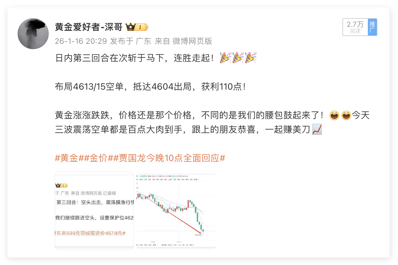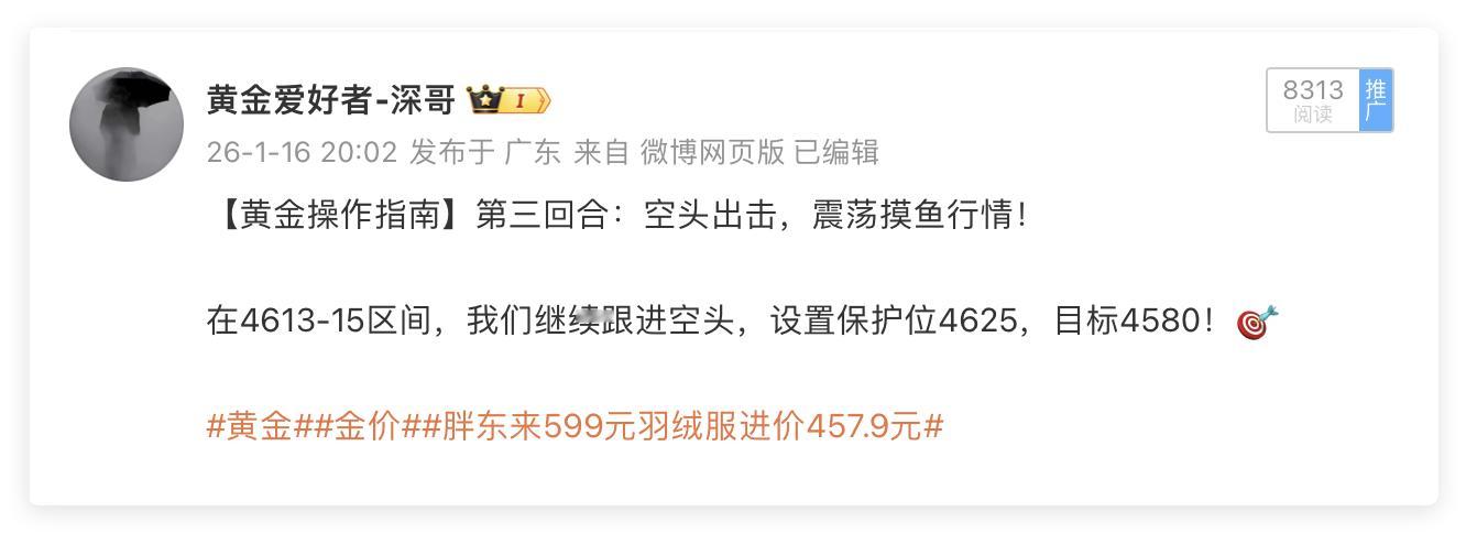 1月16日周五布局回顾:单日战绩350点🎯🎯黄金4615空单,抵达4602出局,获利120点黄金4610空单,抵达4598出局,获利120点黄金4615空单,抵达4604出局,获利110点一周的行情走完,很幸运周五以三连胜的成绩完美收尾。市场中每天都会有很多的挑战等待着我们,很多人喜欢做交易,说实话,这里是平凡人逆天改命的机会,天下英雄如过江之鲫,我们很多时候喜欢以成败论英雄,黄金市场也一样,但在这里,很多成功的交易者最初也都经历了无数次的失败,经历多了,积累多了,领悟多了,明白了交易的真谛,提升了交易认知,自然也对市场更加的敬畏,那么也就知道怎么去做好它了。黄金金价487秒删