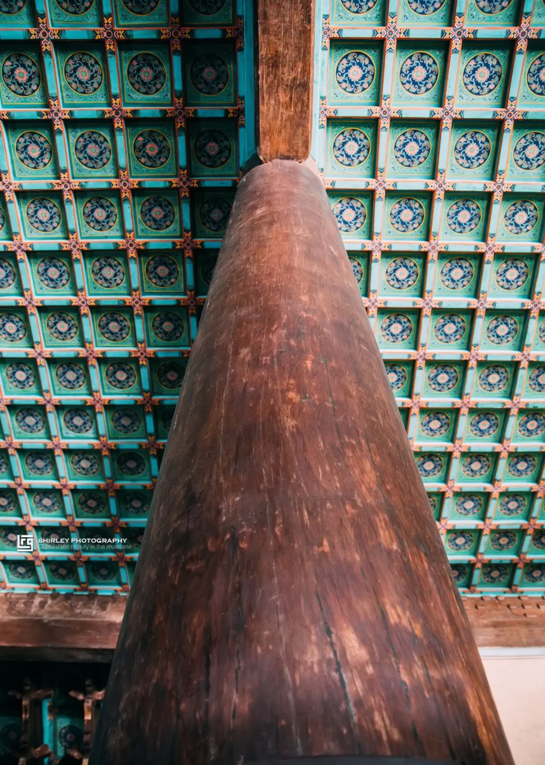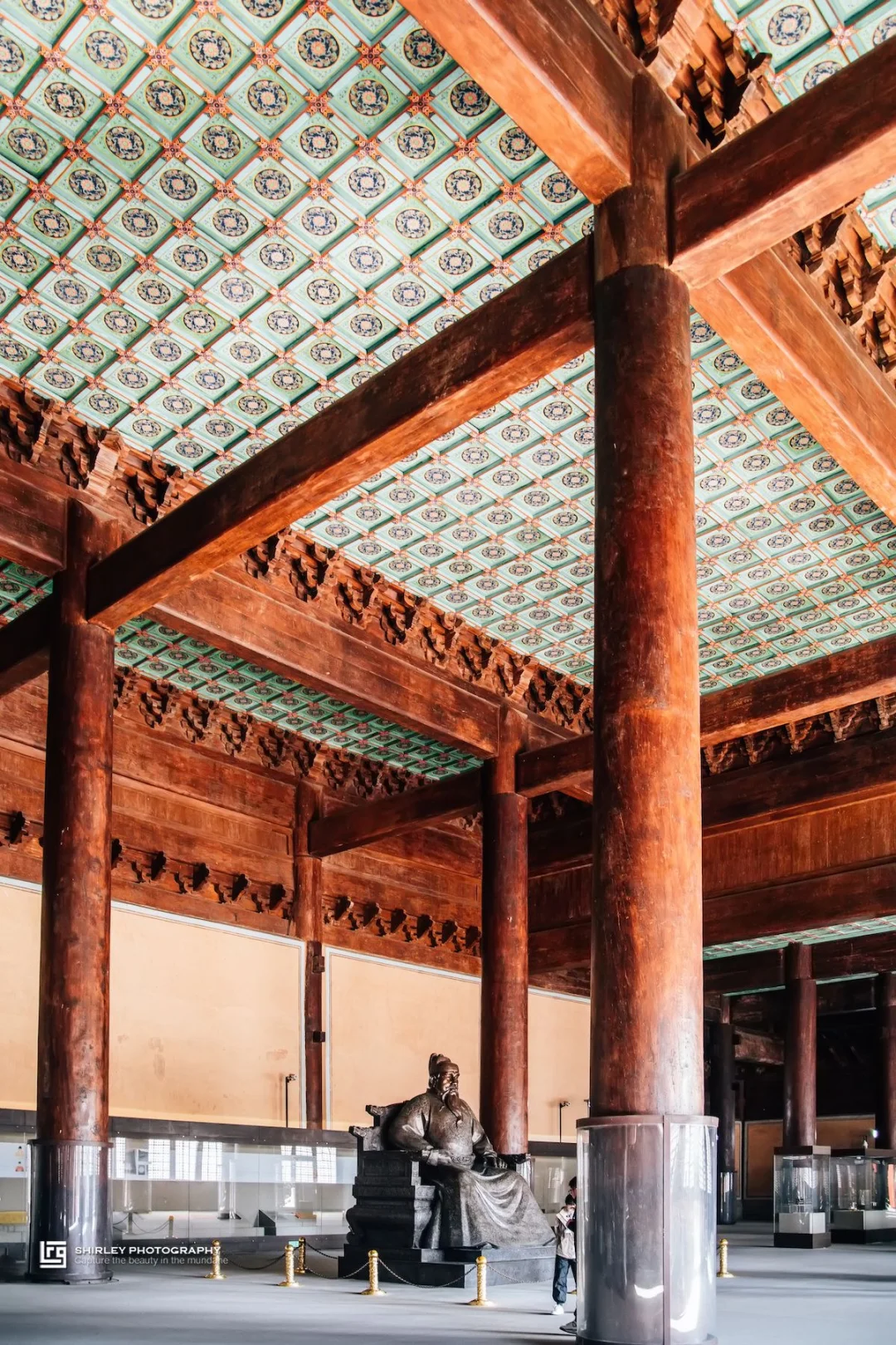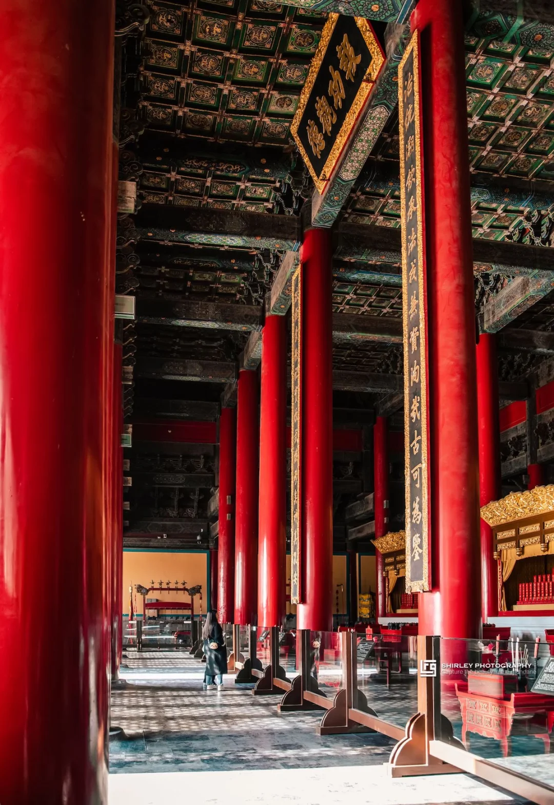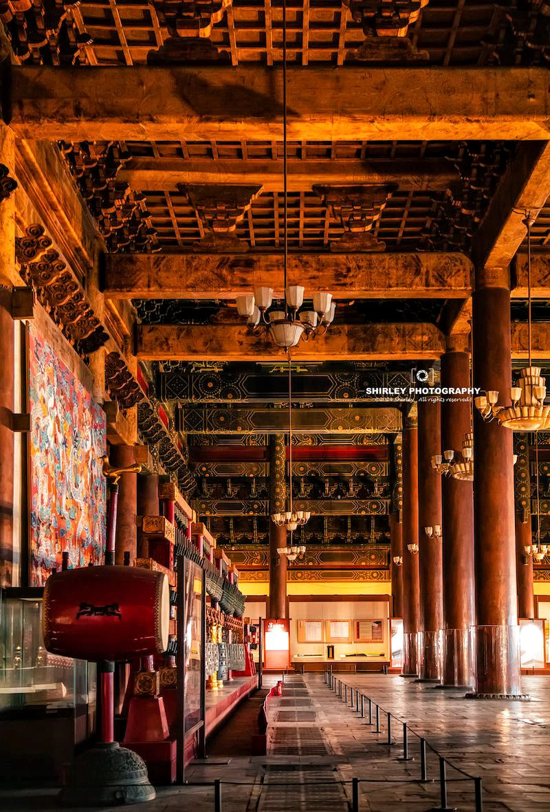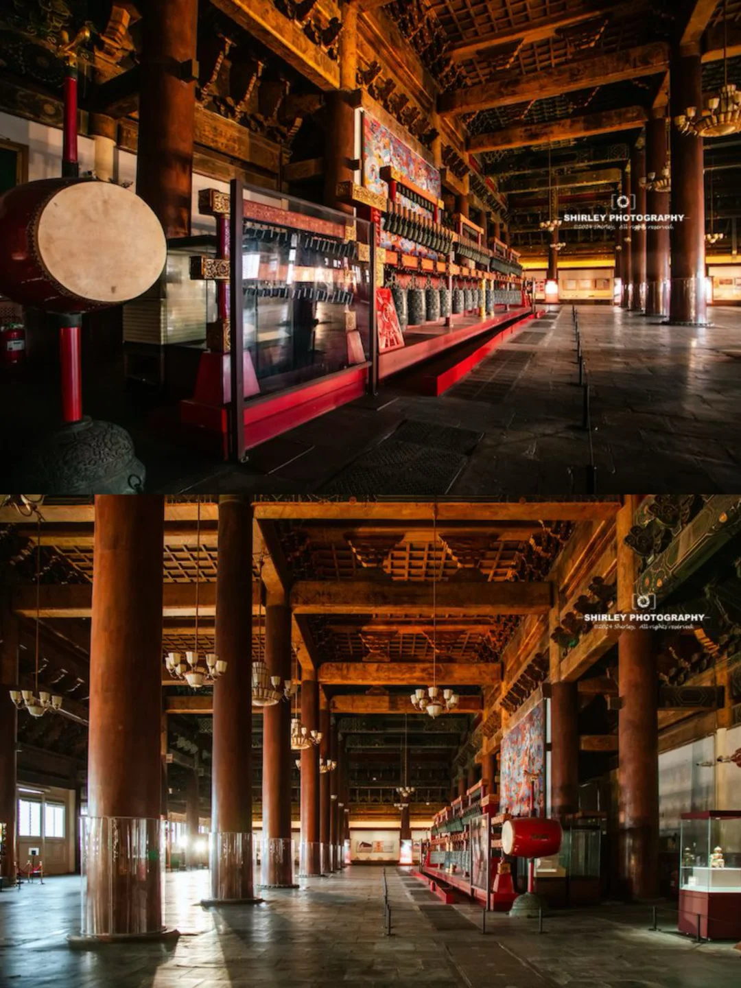 殿内最吸睛的莫过于68根柱子皆是整根金丝楠木,为明代旧物;每根柱子高约13米,直径逾1米,冠绝北京现存古建。