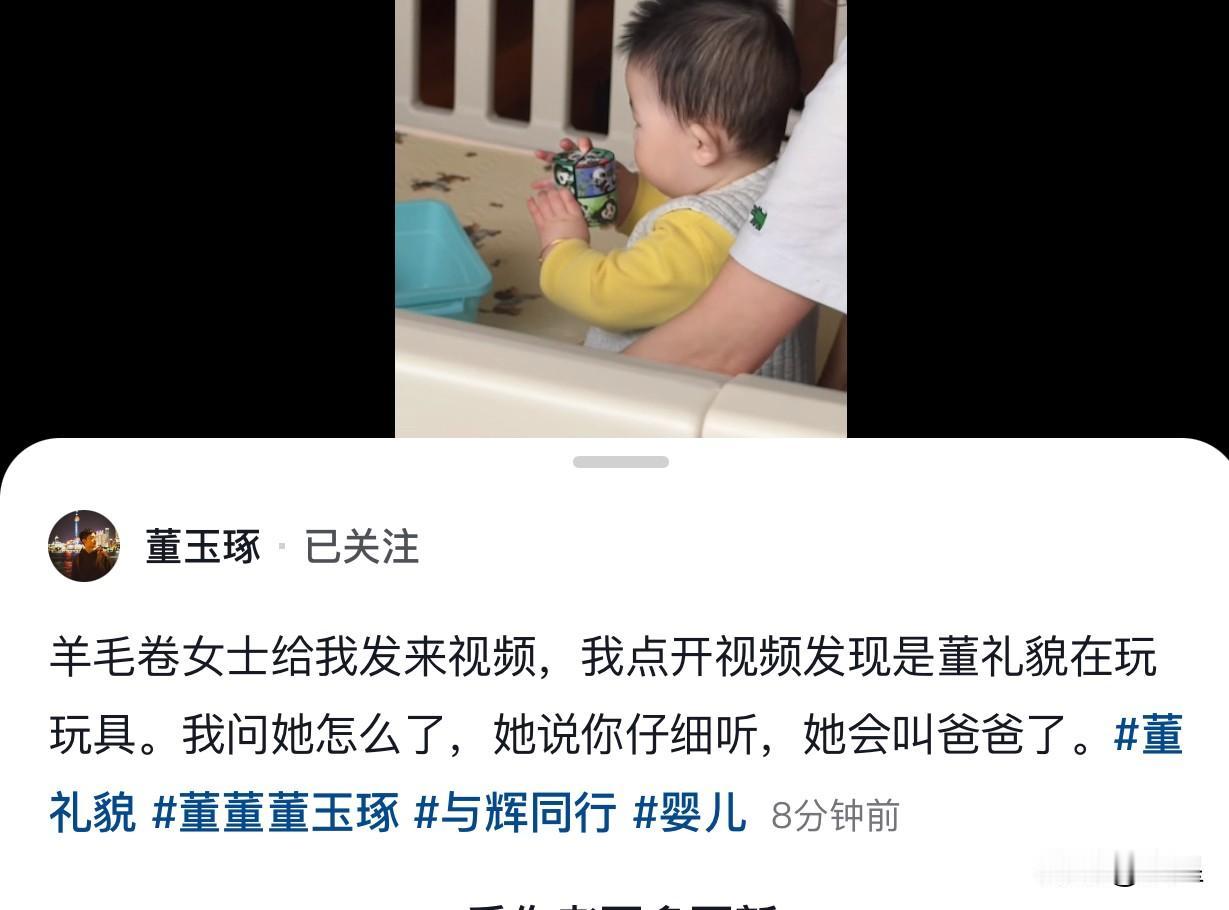 董董刚刚还在用气泡音“油”大家[笑哭] 下播后就迫不及待发了个视频 原来是董礼貌小朋友会叫爸爸了 这会儿董董肯定非常激动 让我们以热烈的掌声祝贺这位奶爸[耶] 但是短期内 确实无法把“油王”和奶爸划等号[捂脸] 不过有个好玩儿的现象 大家似乎很喜欢看董董“油” 他用气泡音叫宝贝儿的切片 点赞和评论特别多 看来清爽帅气的人 哪怕“油”一点大家也不反感 何况还是个有责任、有担当的奶爸 相信用不了多久,董董就能将“油王”和奶爸巧妙融合在一起 让大家丝毫没有违和感[耶]