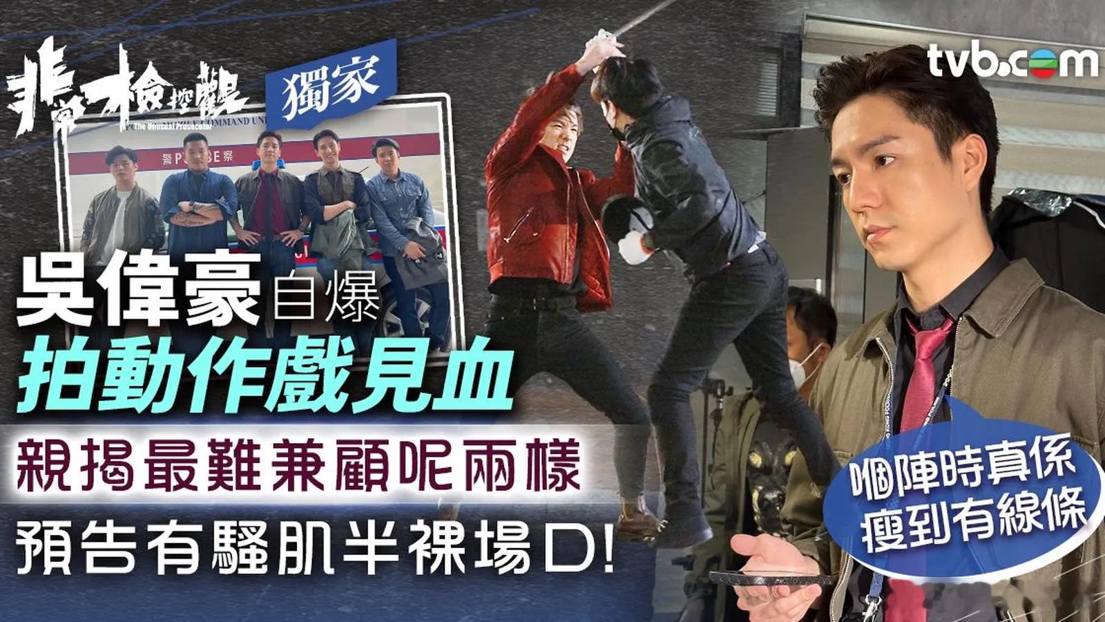 非常檢控觀獨家|吳偉豪自爆拍動作戲見血 預告有騷肌半裸場口:瘦到有線條.TVB全新律政劇《非常檢控觀》,將於1月19日八點半翡翠台播映。當中演正氣警察展熊飛的吳偉豪,在劇裏有連場動作戲打得精彩,令人期待!談到今次他要應付不少動作戲,吳偉豪接受tvb.com獨家訪問自言在事前沒有上特別的動作訓練,「拍攝前我都係做多啲Gym,同拉多啲筋裝備好自己,我都知有唔少出拳同踢腿嘅動作,所以最緊要啲筋鬆,出嚟嘅動作先會夠靚。」他自爆曾有一場要爆玻璃場口,不慎弄傷手見血,「拍打戲難免都會受傷,好似啲手臂、手腕會容易有瘀傷,但我覺得唔緊要,都係好小事,最緊要出嚟嘅效果好。」除了打鬥戲外,他預告有騷肌半裸場口,乃是一直以來努力的成果,「我平時都會喺屋企做掌上壓、引體上升同體重訓練,保持個身形,而拍 《非常檢控觀》嘅時候真係好瘦,瘦到啲線條更加出晒嚟」。至於展熊飛這個角色,吳偉豪直言甚有挑戰,「我都好執着自己個戲做得夠唔夠真實同有冇說服力,而監製佢哋亦好注重我出嚟夠唔夠靚仔,所以要同時兼顧呢兩樣嘢都唔係咁容易。」 另外,今次再度與游嘉欣演CP,他直言二人合作得十分舒服,不用刻意營造CP感覺,「因為劇本寫我哋之間嘅感情線好自然,我哋跟住劇本做已經好足夠,出嚟嘅感覺都好好。」TVB