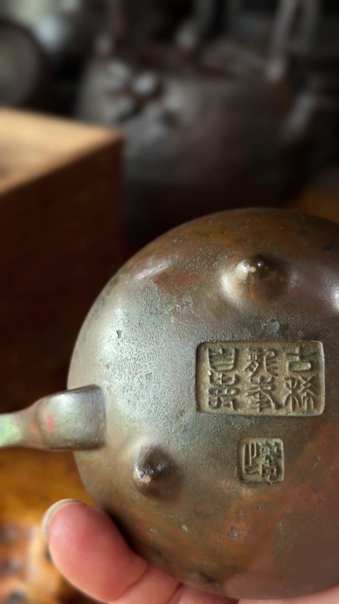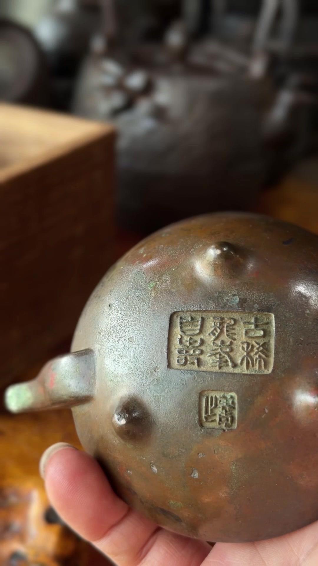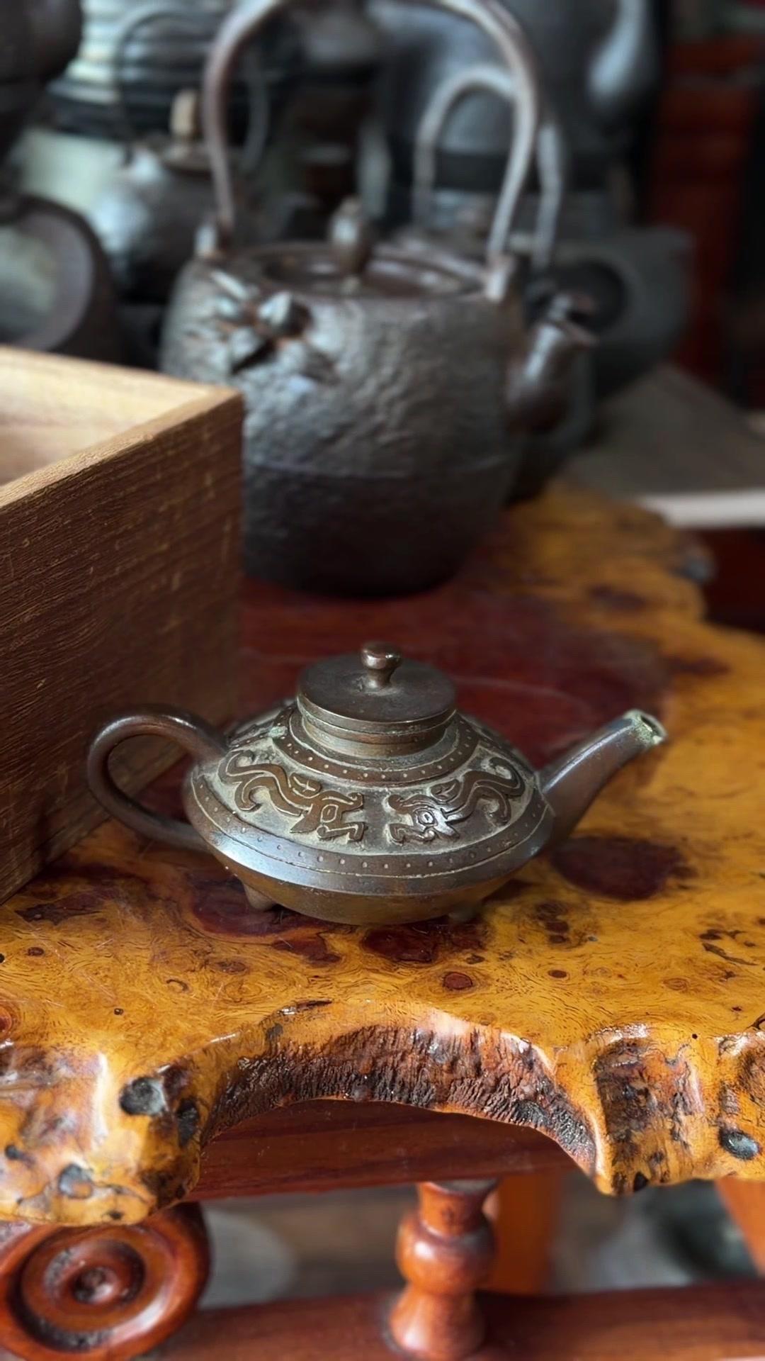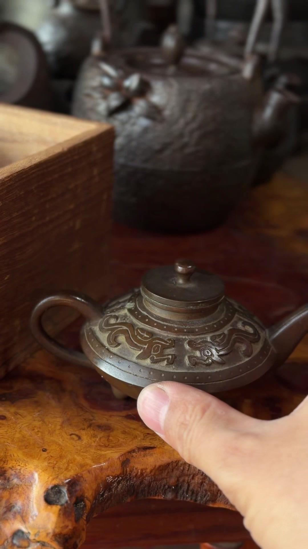 这可是京都高级精工堂口英清堂的传世好物!二代平野英清亲制的昭和初期老物件,还带原盒,妥妥的百年文房宝贝。 87cc满水容量,大小刚好适配书斋挥毫。铜质温润,包浆厚重,是时光沉淀下来的独特质感。器身后手浮雕饕餮纹,线条古拙有力、张力十足,复刻了商周青铜的古韵,把金石气与文房雅趣融合得恰到好处。 英青堂自清代就是日本顶尖铸铁铜器作坊,以高质低产闻名,连海派大师吴昌硕都为它题写匾额,这份跨界认可足见其地位。纯手工精铸的工艺,出水流畅不滴漏,既是实用的研墨利器,更是藏赏皆宜的金工精品,握在手里满是匠人心血与文人雅韵。