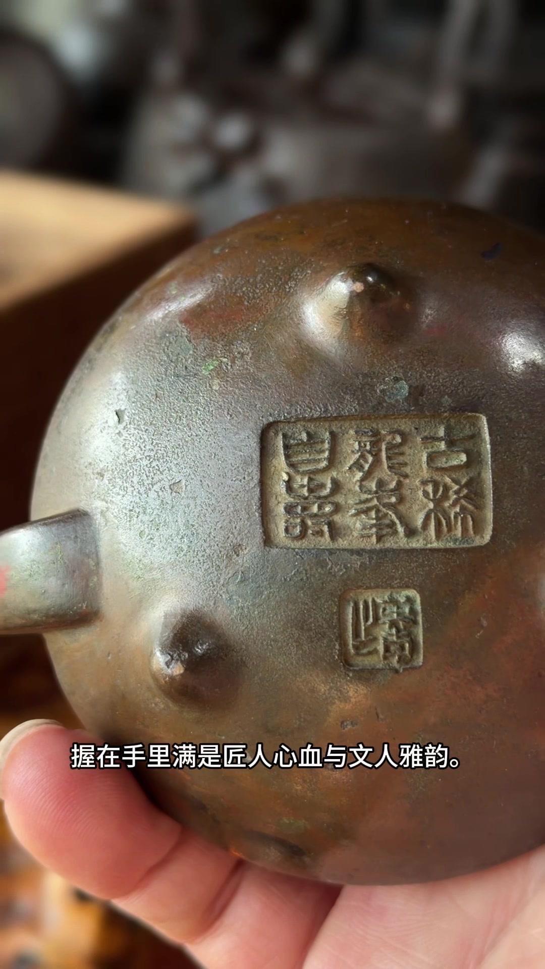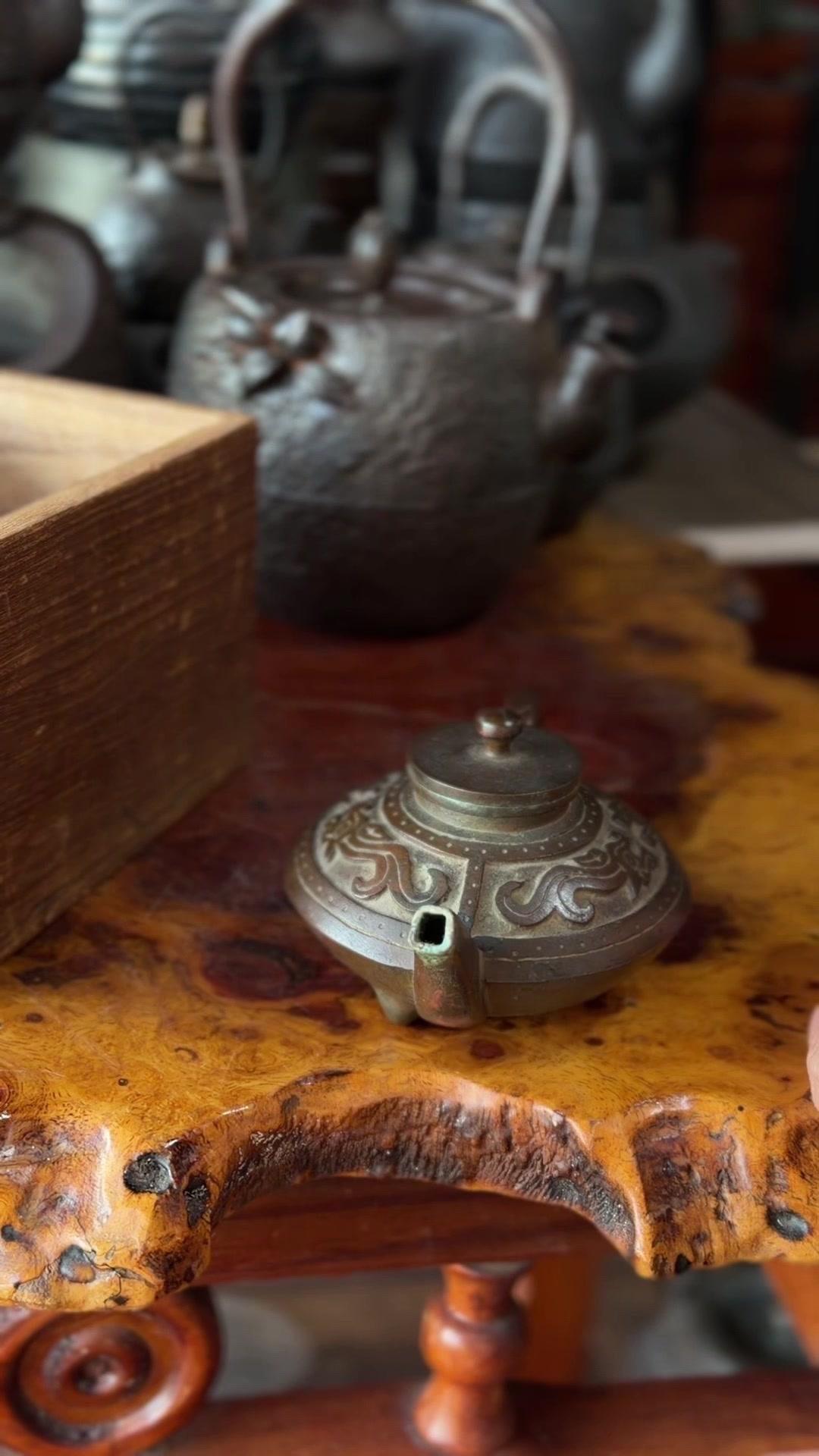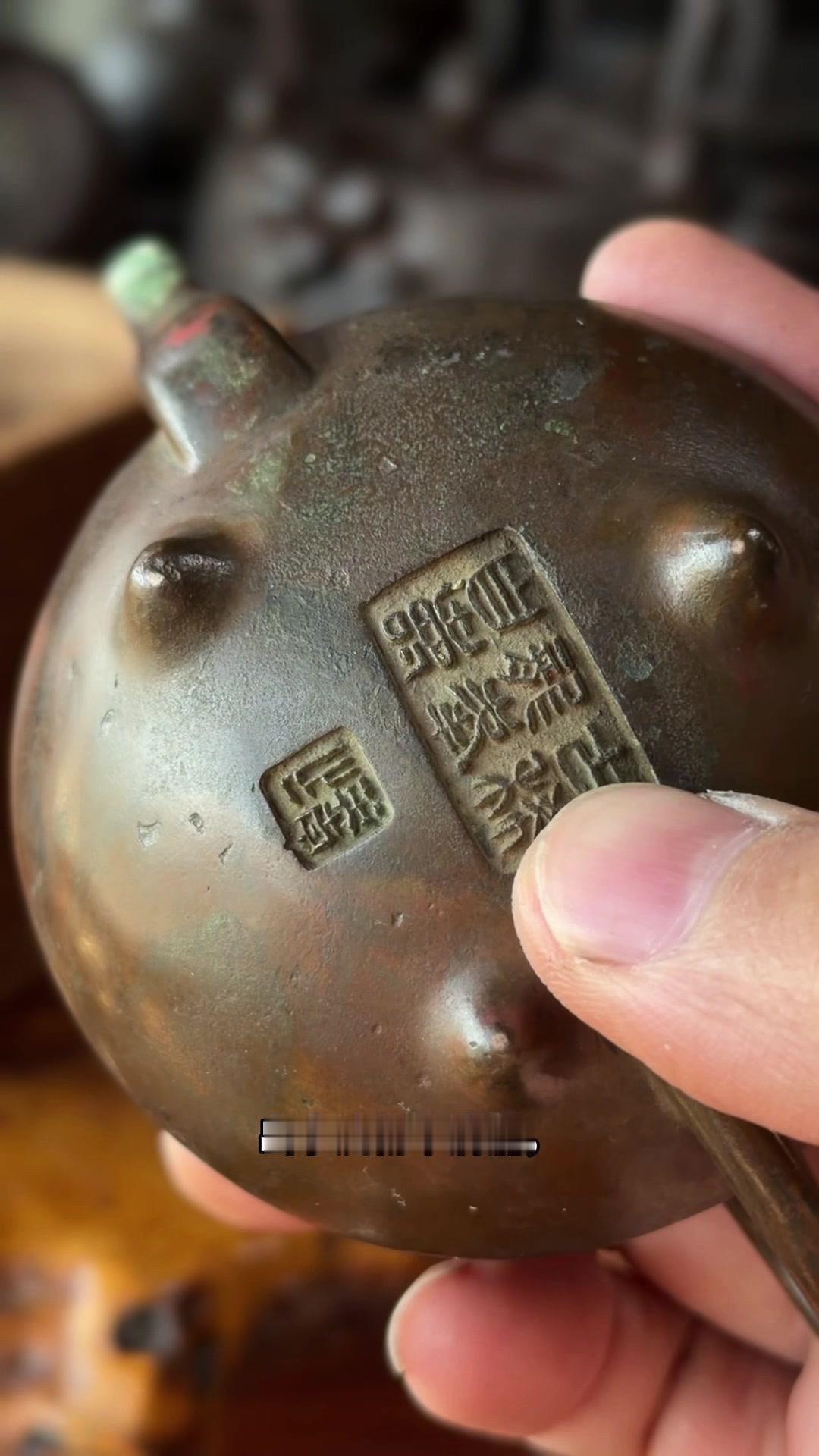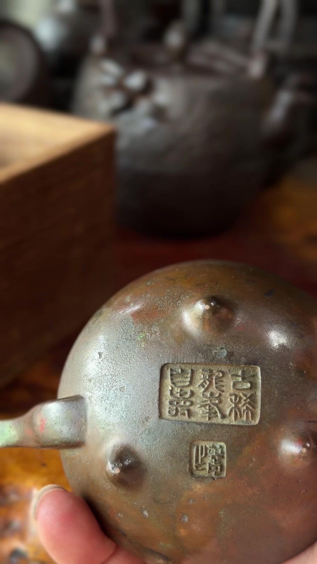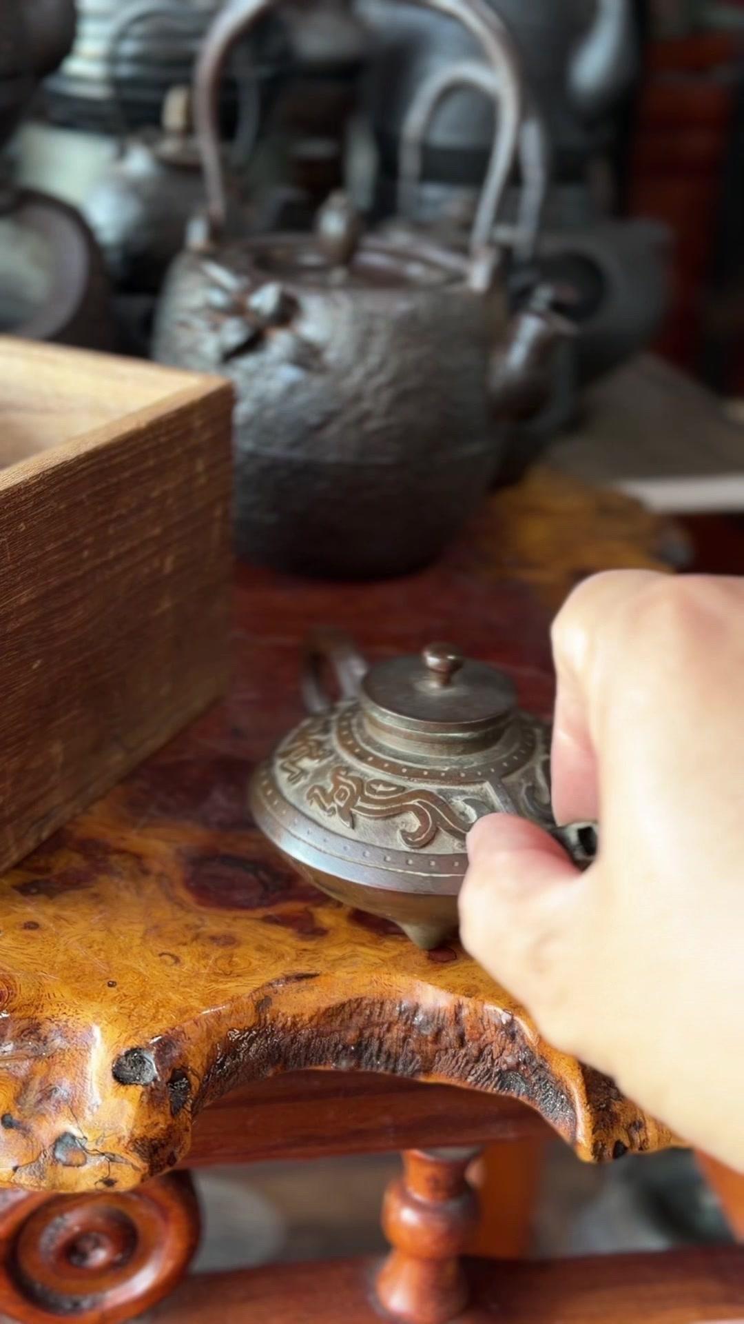 这可是京都高级精工堂口英清堂的传世好物!二代平野英清亲制的昭和初期老物件,还带原盒,妥妥的百年文房宝贝。 87cc满水容量,大小刚好适配书斋挥毫。铜质温润,包浆厚重,是时光沉淀下来的独特质感。器身后手浮雕饕餮纹,线条古拙有力、张力十足,复刻了商周青铜的古韵,把金石气与文房雅趣融合得恰到好处。 英青堂自清代就是日本顶尖铸铁铜器作坊,以高质低产闻名,连海派大师吴昌硕都为它题写匾额,这份跨界认可足见其地位。纯手工精铸的工艺,出水流畅不滴漏,既是实用的研墨利器,更是藏赏皆宜的金工精品,握在手里满是匠人心血与文人雅韵。
