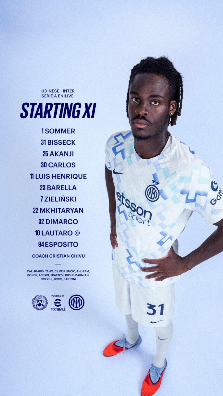 国米首发:1-索默、31-比塞克、25-阿坎吉、30-奥古斯托、11-恩里克、23-巴雷拉、7-泽林斯基、22-姆希塔良、32-迪马尔科、10-劳塔罗、94-埃斯波西托