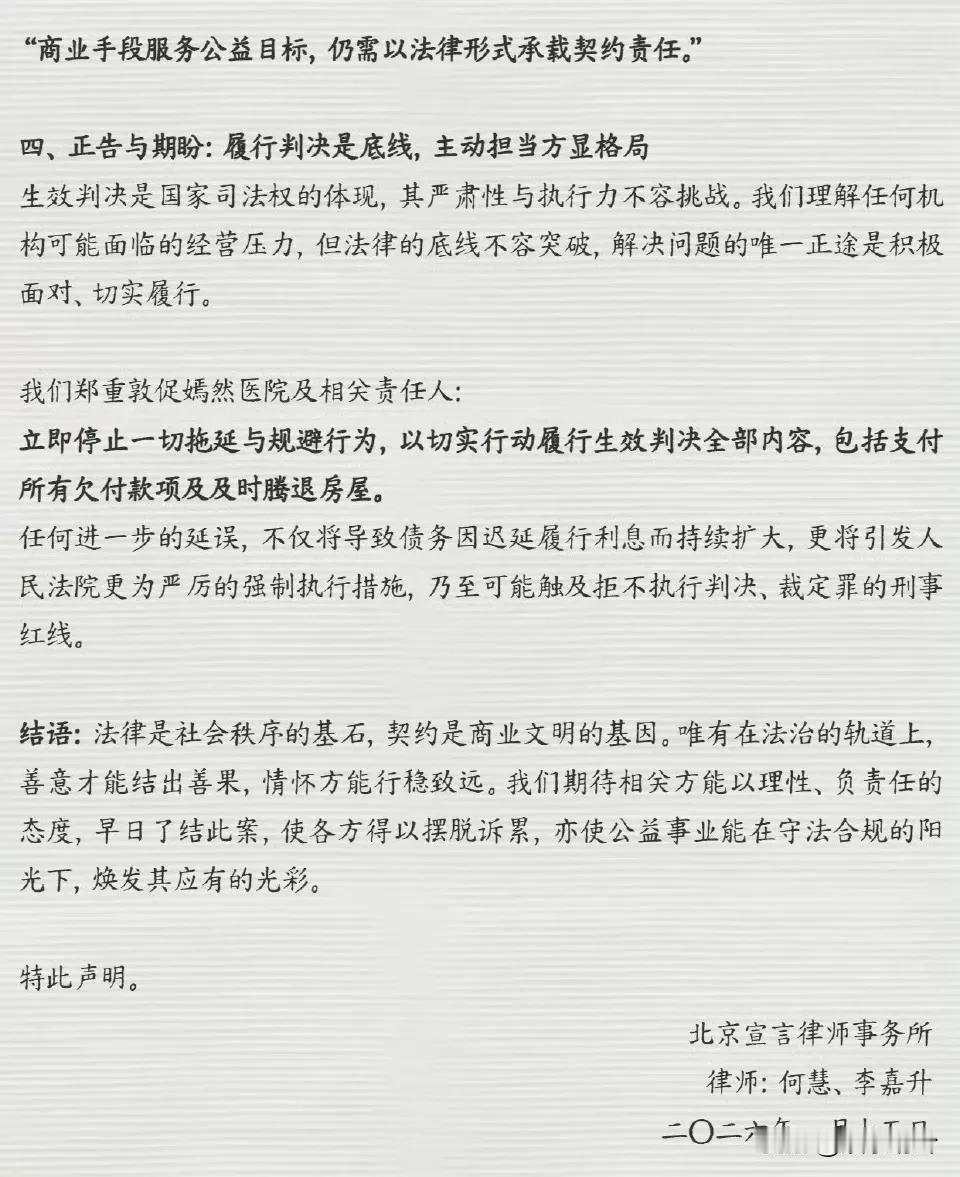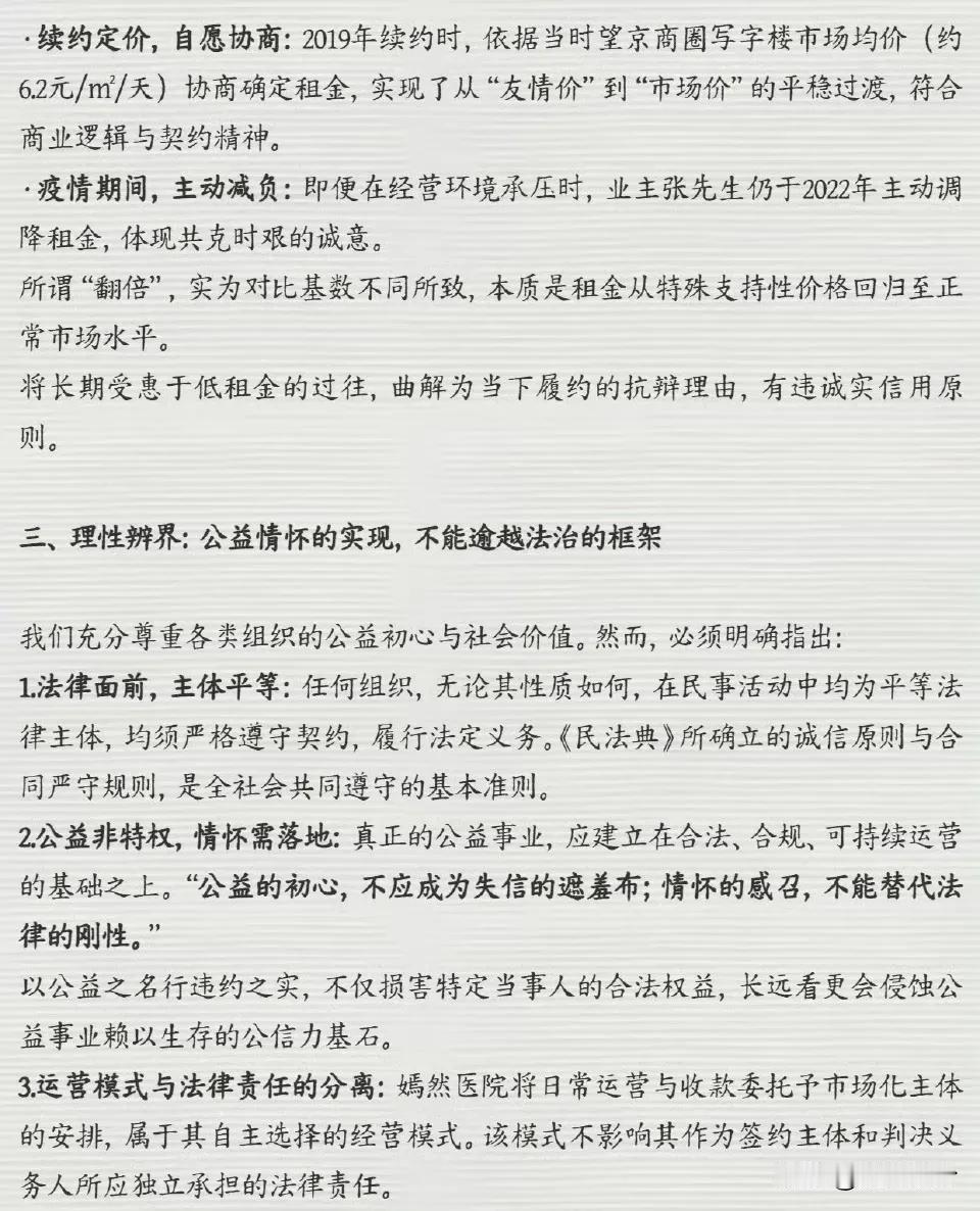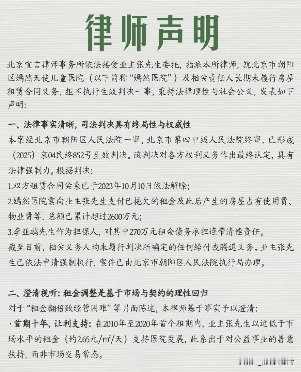 说句难听的话,网友捐款解决不了嫣然天使儿童医院的困境,因为房东的律师声明里写的很清楚,双方早就于2023年10月10日解除租房合同。 现在医院拖欠的2600万不仅是之前未付的租金,还包括解除租约之后,经法院认定过的的房屋占有使用费和物业费,其中270万是由李亚鹏担保的。 目前李亚鹏的态度是,不支付拖欠费用,也拒绝腾房,言下之意就是要求房东减免费用,否则就只能关停医院;而房东的态度是,要么付清拖欠费用并腾房,如果继续租用,在完成前述条件之后要按新的租金续约。 不做价值判断,不做动机揣测,只是有一个疑问,为什么李亚鹏宁可将嫣然天使儿童医院烂在手里,也不转给有能力的人去运营?到底是为什么???