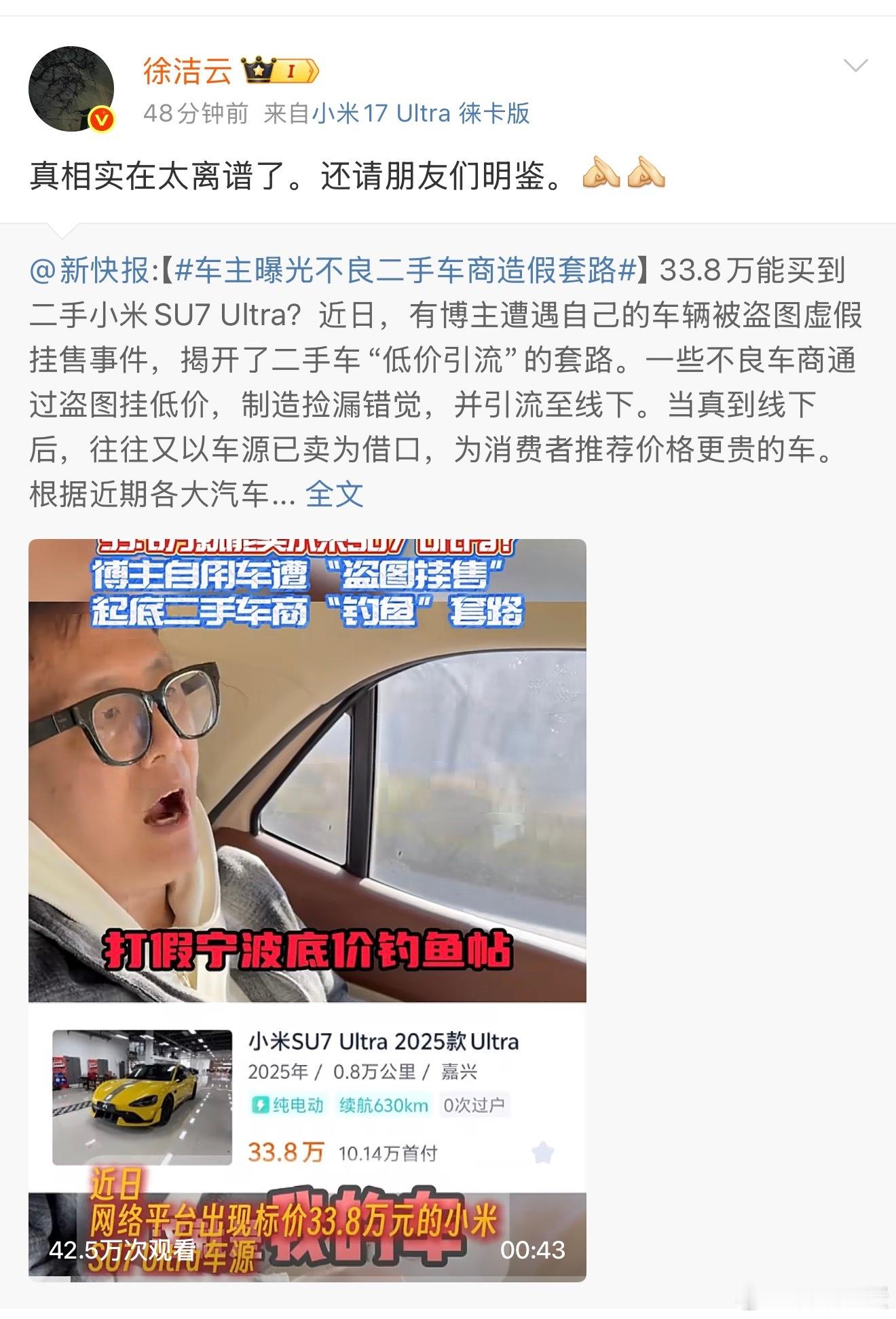 二手低价卖热款车这件事已经好多天了,狗蛋在一开始就觉得这件事本就特别荒谬,不会有人信的,结果,还真有不少人相信了……大家动脑子想想,在信息相对透明的今天,一台热门新车在二手市场出现低价,本身就是最大的反常信号了。更何况二手车市场本身存在严重的信息不对称。车况、来源皆不透明,这给了不良车商操作空间。他们压根不用真实车源,用一张图片和一个离谱低价,就能低成本地筛选出潜在客户。而且基本上没有为这个代价买单的后果,即便被平台下架或用户投诉了吧,他们换个账号重新发布,违规成本很低。也暴露了平台在信息审核和信用惩戒机制上的不足,所以让套路得以重复上演。这件事,不只是小心骗局,更要提醒大家,在面对任何看似巨大的便宜时,不妨先问自己一句,为什么这好处偏偏落在我头上?把这个问题想明白,大多数的套路也就失效了。买车是件开心事,别让捡漏的心态,反而给自己添了堵。徐洁云转发辟谣低价能买二手小米车