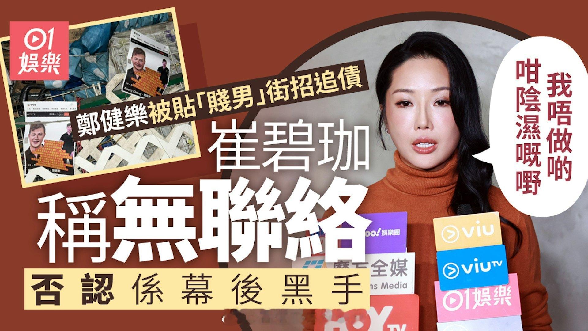 香港01:郑健乐被贴街招追数 崔碧珈否认是幕后黑手:我不做这么阴湿的事崔碧珈(Anita)与“大只Rocky”郑健乐的“父女恋”绯闻,由高调示爱到短短一个多月内急转直下,由互赞变互讽,崔碧珈更在社交平台发文,指“有人”不停主动加她身边朋友,要求对方“找过其他目标继续装单纯啦”。随后郑健乐发文反击指:“会不会是有心人想无心人,令无心人变有心人,无心人是清白”暗示有人故意误导,二人关系极速玩完。 与此同时,郑健乐近日又被人贴街招追数,遭指“欠债不还、吃软饭、香港世纪渣男”,形象插水,再度成为全城热话。面对“世纪贱男”的指控,Rocky今日(17日)终于在IG“蒲头”,以黑底白字写下充满佛家因果论的字句回击:“伤害过你的人,在伤害你的那一刻,他的果报就已经开始了,任何事情都有因果,该有的一定不会少,果报也许会迟到,但永远不会缺席,凡事都有轮回,你看苍天饶过谁!”崔碧珈今日(17/1)现身尖沙咀出席分享会,她就事件接受《香港01》访问时表示:“其实他是不是渣男,首先就要怎么定义,而且我在五天里的训练只是见过他两次,所以我就不是好知道他本身这个人,但起码和他训练是很多正常。(他会不会口花花又细心?)对我也都是正常好普通没什么特别。(会不会很多暗恋你?)不会,因为给人的感觉可能平时的我是好强,所以没什么人追,他算是好大胆的那个来的。”对于Rocky被贴街招,有网民猜测是她所为,崔碧珈就表示:“那么如果我没做过,我又觉得我不需要讲是或者不是,首先我不做这么阴湿的事,因为我都好敢言,加上社交网站都一是一个渠道,其实我直接讲不就行了,不需要那么做那些事。”提到Rocky今日出Po疑似反击,崔碧珈就表示:“其实我不是好消化到他的说话,我觉得他每一句说话都不一定关于我,人生不是为了我而转,他可能有其他新目标,变成他讲话是给其他人。(大家没联络?)没联络。”