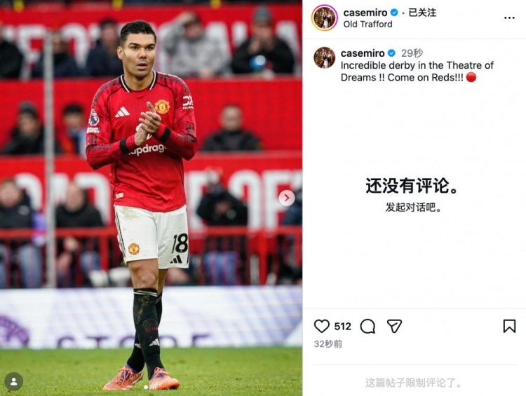 卡塞米罗社媒写道:“梦剧场上演了一场不可思议的德比!!加油,红魔!”