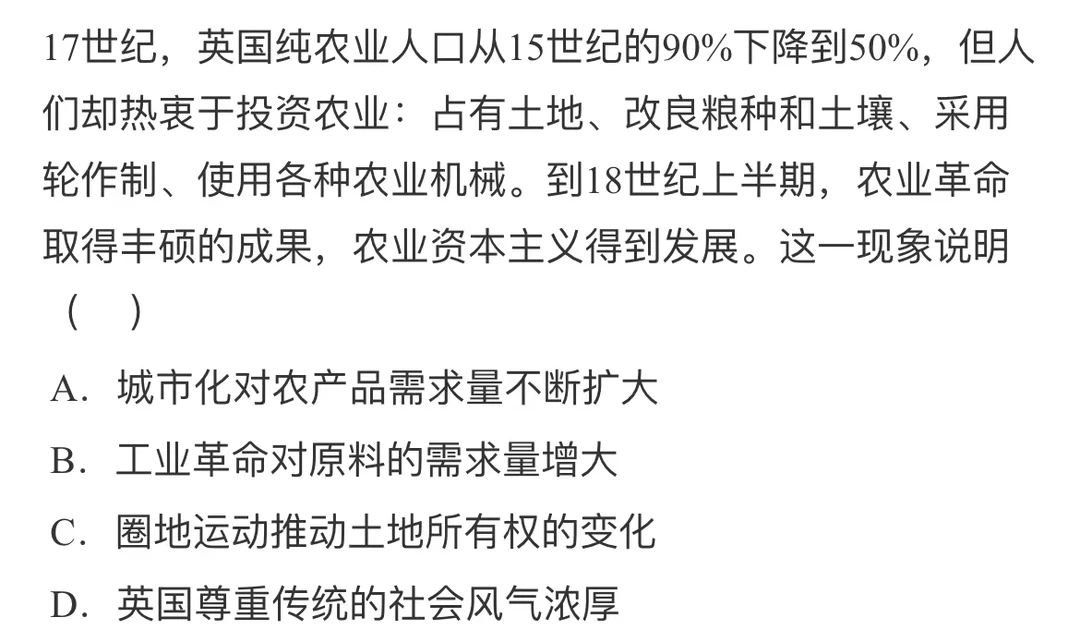 当时仍然是自给自足的小农经济,不能体现小农经济被破坏,排除A项;